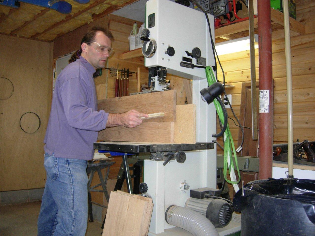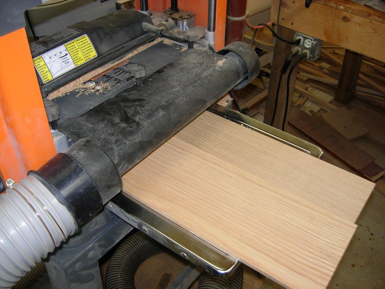 Today I finished glueing the side panels as well as the top and the shelves. The ambo panels will be separated by 10-1/2″ tall and 1/4″ thick dividers. I only have 6-3/8″ & 4-3/8″ wide boards that are 7/8″ thick before planing. I glued (5) 6-3/8″ pieces to (5) 4-3/8″ pieces to get 5 boards that were over 10-1/2″ wide. After they dried overnight, I resawed them to approximately 3/8″ thick boards that I planed down to 1/4″ thick. I also finished up planing all of the other boards for the assembly. The next step will be to cut all of the glued-up panels down to the proper size and scrape off all of the glue that squeezed out during clamping.