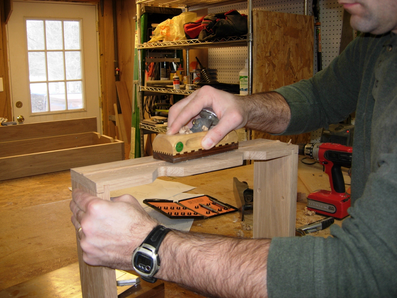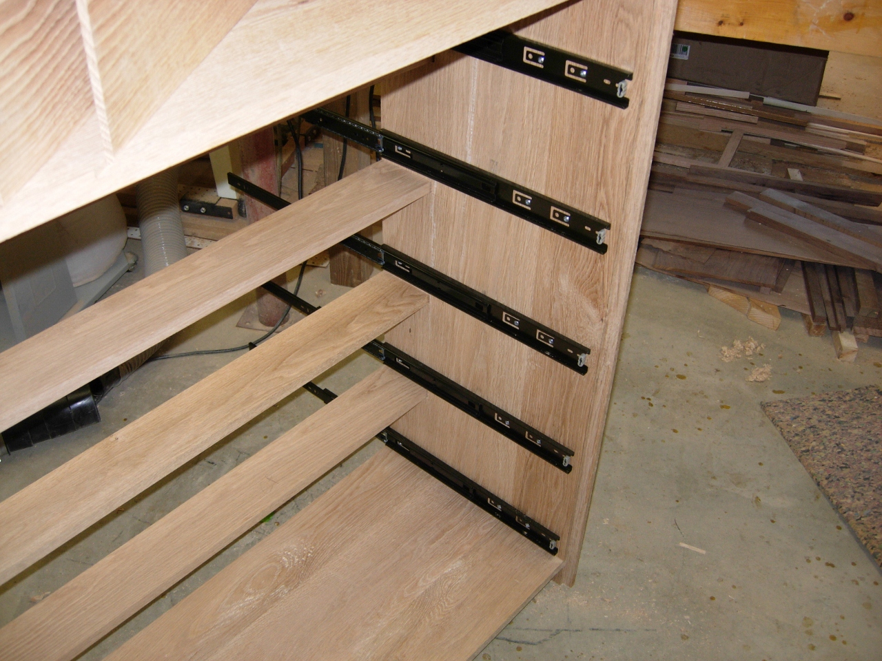 Things started out well today. I got the drawer slides installed fairly quickly using my new drawer mounting jig from Kerg. Then things went downhill from there… Once the slides were installed, I tried to install the drawers. They were 1/8″ too wide. My wife complains that I never read the directions. Well this time, I did. The directions indicated that the drawer should be 1/2″ smaller than the cabinet’s inside width. Mine was exactly 1/2″ narrower. See what reading directions gets you? So, how do you remove 1/8″ from a glued and nailed drawer? I put my table saw fence right up against the blade and took a kerf of the top and bottom of the drawer leaving a 3/8″ piece sticking up in the middle so the drawer didn’t rock further into the blade. Next, I set the nails below the new surface and proceeded to plane down the 3/8″ piece. With a little sanding and planing, I now have five slightly narrower drawers. The drawers installed just as easily as the slides, but installing the drawer faces was a bit more of a challenge. I only left 1/4″ clearance between the drawers so there was not a lot of room for error. After I got them all installed and unclamped, one drawer popped out on the left. Apparently the drawer frame twisted and the box is no longer square. I made some gussets to square it up, but I may wind up remaking the drawer if I am not happy with the fix. I finally did finish with the drawer install though. Better luck tomorrow…