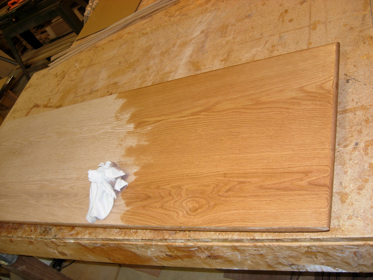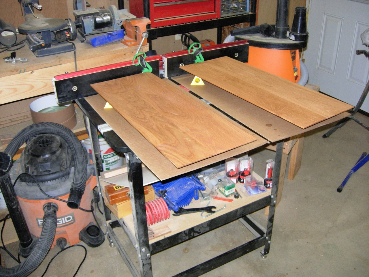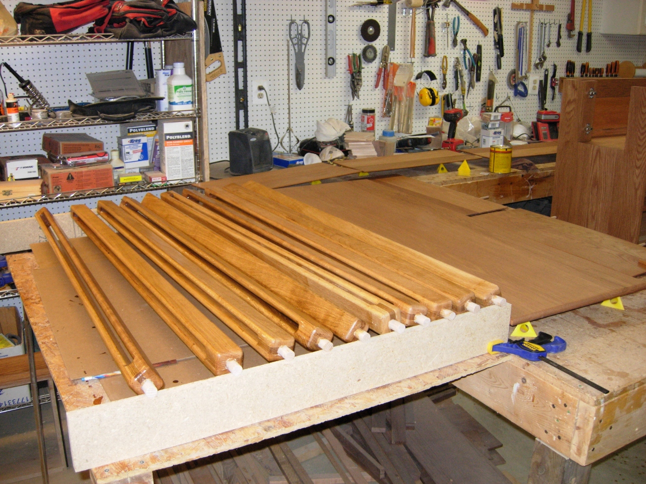 Getting down to the home stretch. I would like to finish this weekend. Today my youngest son and I spent about an hour cleaning and vacuuming the shop in preparation for staining and finishing the cabinet. My nine-year old finally gave up on all the fun and went to watch cartoons. I broke out the stain and an old tee-shirt and started staining the top. After that, I started on the divider panels. This managed to take up nearly every clear space left in my shop. I even put a few pieces on the router table (surface covered with cardboard). For my birthday, this year, My little helper gave me a “paint and odor” respirator mask. I thought this would be a good time to try it since it was too cold out to open the windows. It worked very well, the fumes didn’t bother me at all. After everything was stained, I still had the outfeed wing on my workbench clear. Seemed like a good place to start applying urethane to the spindles. Since I didn’t want to have them dripping and sticking to my bench, I used some clamps and some 4″ stock to create some temporary rails to rest the dowel ends on. After the urethane was applied, I could continue to spin the spindles to check for drips. It worked well and I was done those in about an hour. Since everything needs to dry and there is no place left to work, I will knock off early tonight. I still have at least an hour before midnight. Time enough to post this before I go to bed.