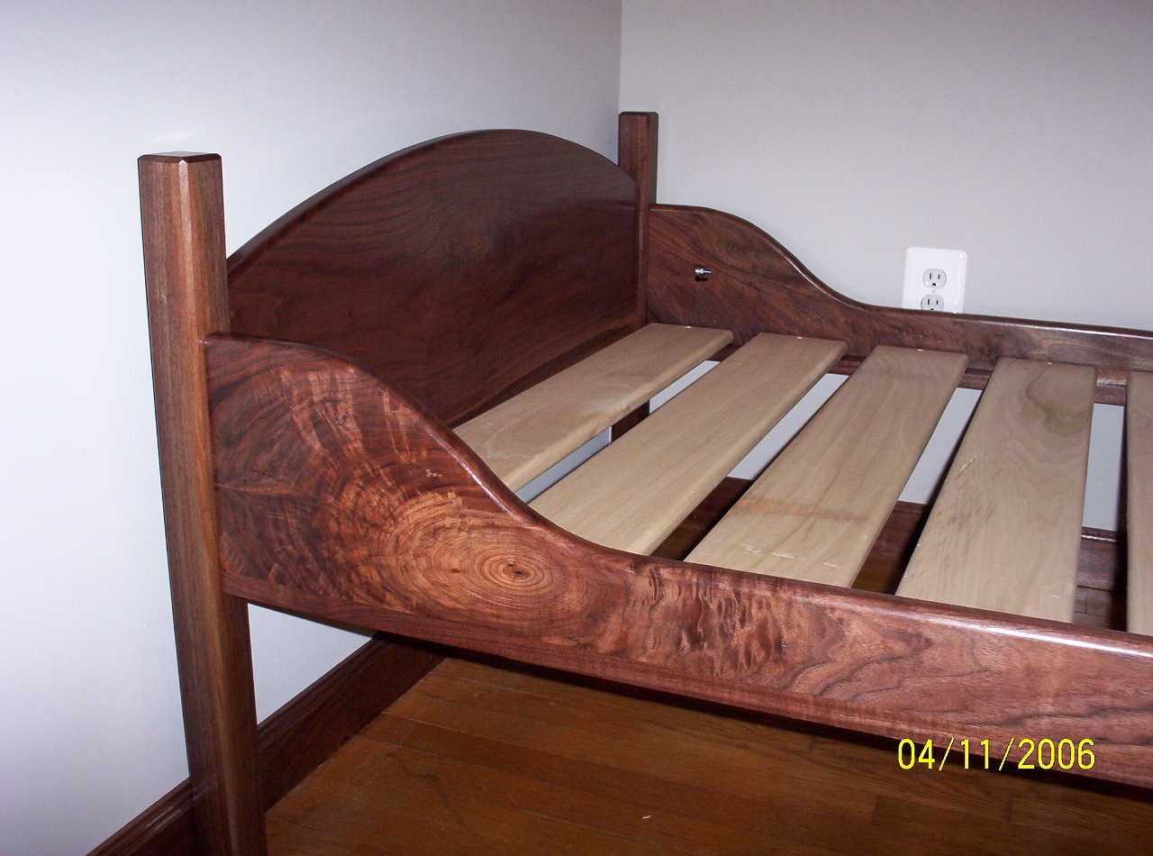 A few years back, my oldest son decided that he was tired of his bedroom. He had just become a teenager and didn’t want his room to look like a little boy lived there. I sat down with him and we came up with a plan. We got rid of the bright, happy colors and painted the room a nice grey and burgundy. Teenagers don’t like happy colors, then people assume that they are happy, and we just can’t have that… He also wanted new furniture. My father had recently cleaned out his small shop area and found a sheet of 3/4″ black walnut plywood that he had no use for. Black walnut is my favorite wood to work with. That got me thinking, Why don’t I redo the whole room in black walnut? This was a bit ambitious at the time since I had far less tools than I have now. I went to a friend of mine that has a saw mill. He kindly agreed to sell me some walnut at $2.50/foot. This was ever so nice of him since he normally sold it for $12/foot. Several weeks later I had made all new trim for the room. I even made rosettes for the doors and windows. I made new shelves and a desk with the plywood, and I made a new bed. The bed was the center piece. I had found plans on the web for a shaker style bed. It didn’t seem too far out of my range of abilities, so I gave it a try. It turned out beautifully.