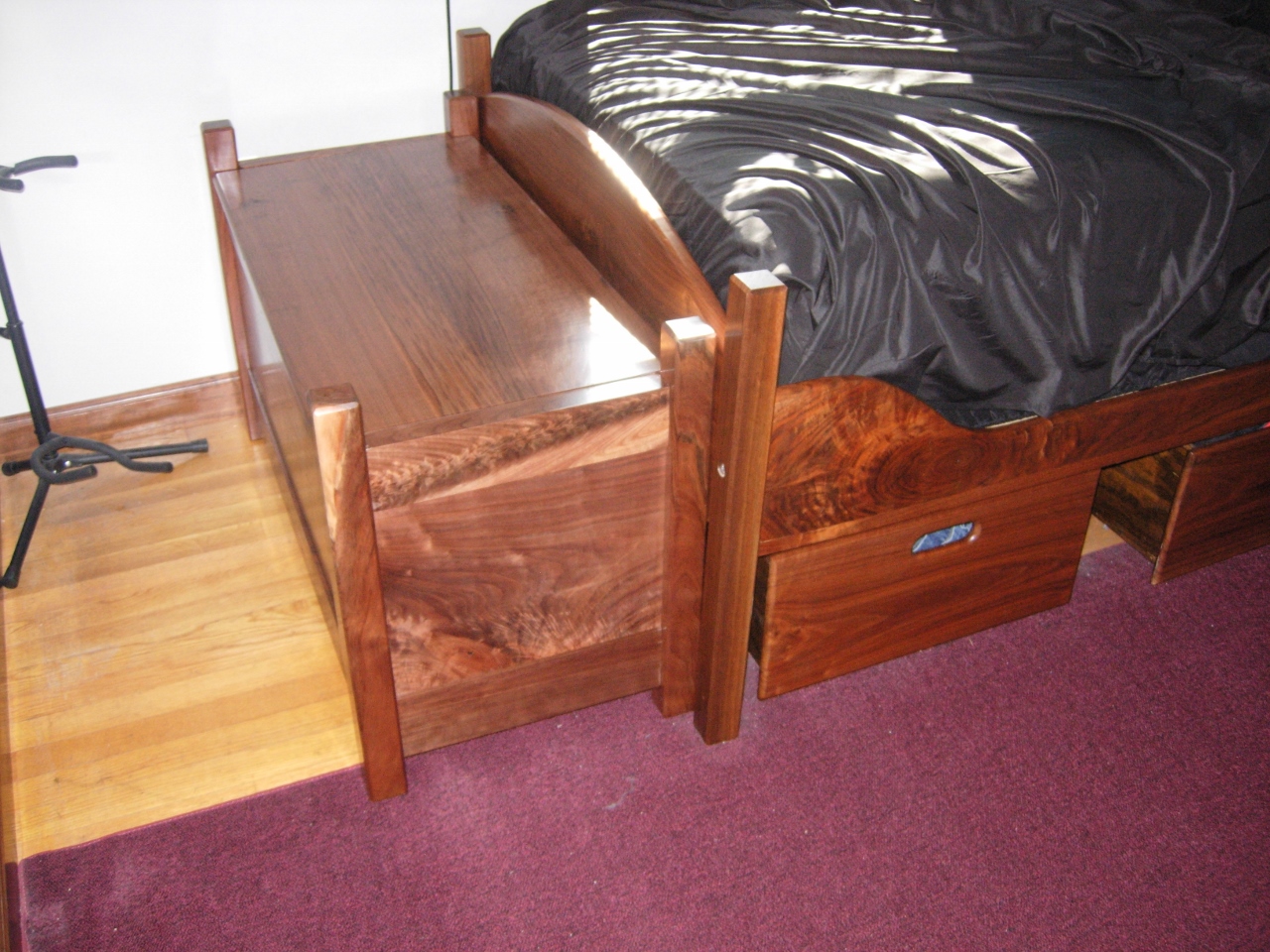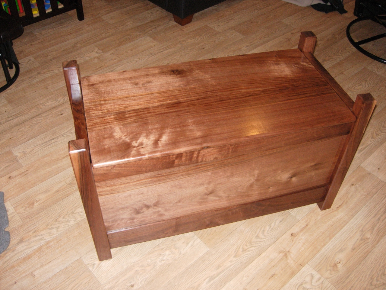 Flash forward a few years. My oldest will turn 18 next week. Smiles a bit more these days… He had mentioned that he could use a little more storage space, a few months ago, and I thought it would be a good opportunity to drag him down to the shop and have some father son bonding time. I was at my buddy Phill’s helping him with something, and I mentioned that we were going to build a chest for the foot of the bed. He said “Oh I have a bunch of old walnut up in the barn from a tree that I cut down ten years back or so.” He asked my if I wanted any… A truck load of walnut later, Eric and I started working on plans for the chest. I am a mechanical designer that does architectural design on the side. How hard could it be? We wanted something that would match the bed, but the bed had those big 2″x2″ posts at the corners and I was having trouble working those into a chest, so that it matched the bed. About fifteen revisions later, I came up with something. I then stumbled across a picture in the fine woodworking reader gallery of exactly what I was looking for.