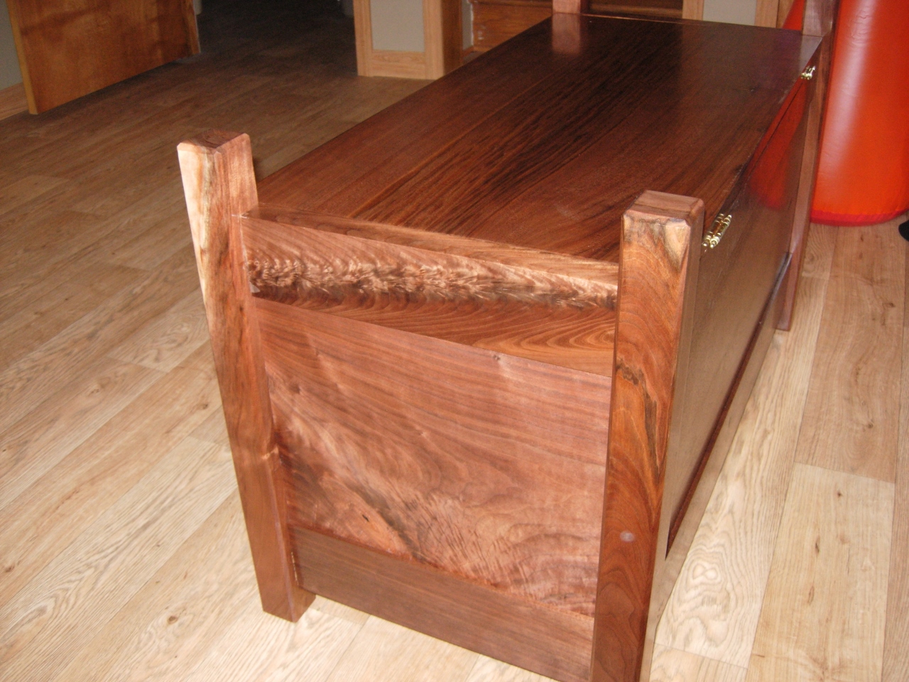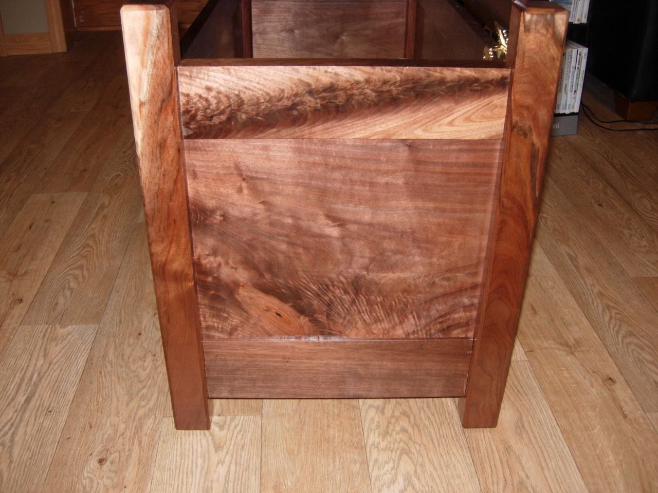 I won’t bore you with too many details (because I forgot to take pictures till I was almost done). I made the front and back panel one solid piece instead of three panels. The other thing I changed was to make the floor out of tounge and groove cedar (also donated by my buddy Phill). This project really stressed my OCD side because I let it sit in the shop until I could work on it with my son. He is busy with class, work, and friends. But he did manage to squeeze in some time on the weekends with me in the shop. I had managed to save a couple of small chunks of wood, left over from the bed, that had a pretty burl. We decided to put it on the side of the chest that would sit right next to the burl on the bed. The chest looks nice right next to the bed. The bedroom looks nicer with all of his clothes in the chest instead of on the floor…
