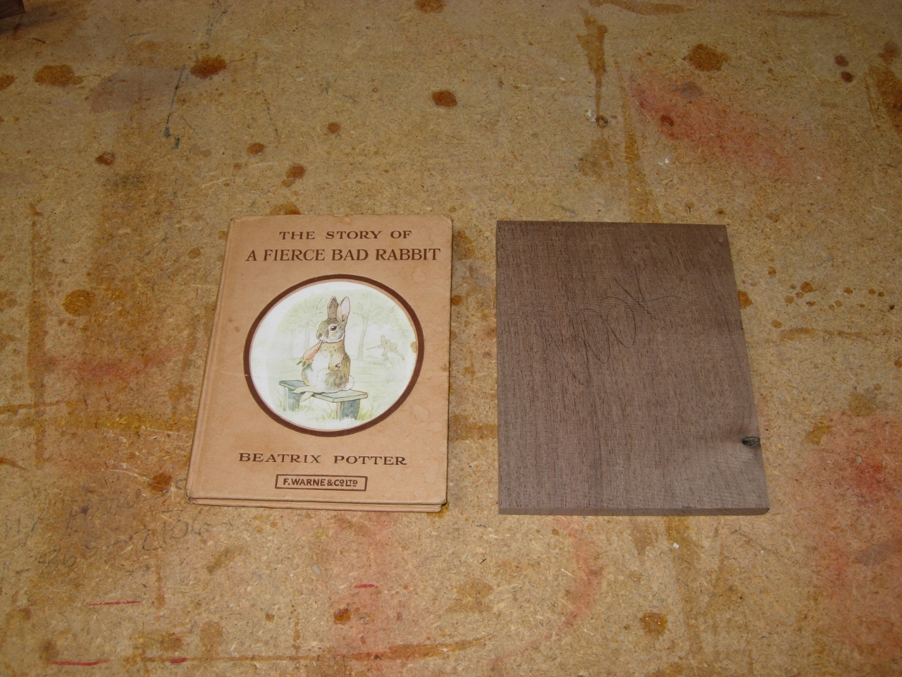 A couple of weeks ago, a co-worker asked if I could make a shadow box for a book that she received as a gift. Last night I finally had a chance to get started on it. I want to make it out of walnut so I started by rooting through my scrap pile of left-overs from the walnut chest I made. I had a couple pieces left of the resawn panel so I made a back panel for the box with the big piece and a mock-up of the book with another. Since the book is older and a bit valuable, I made the mock-up for any spacing or test fitting I needed to do. This way I don’t damage the book.