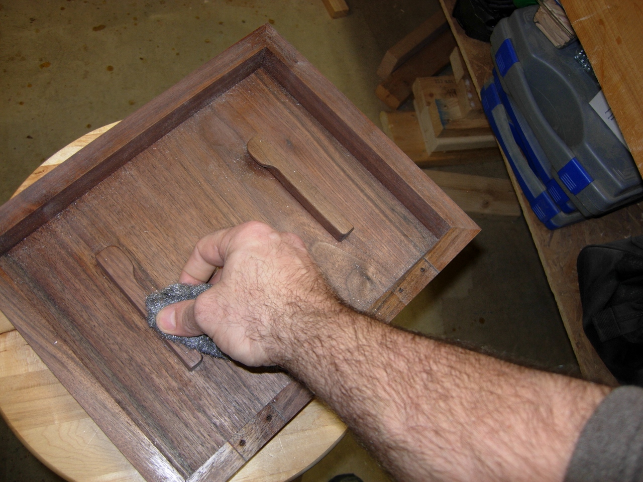 This is a small project, so it is easy to clean up. I decided to go back to steel wool to rough up the first coat of urethane. I like the steel wool better than the scotch-brite pads, but it leaves a lot of broken pieces of wool behind. After everything had been sanded, I cleaned it off with some compressed air and I checked to make sure no bits of steel wool were stuck in the corners.