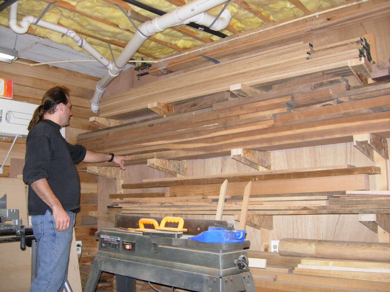 The first step is to pull a piece of wood from the wood rack. Normally, that would be a simple task, but I wanted to use the piece on the bottom. This piece is just wide enough to make the guitar out of just the one board.