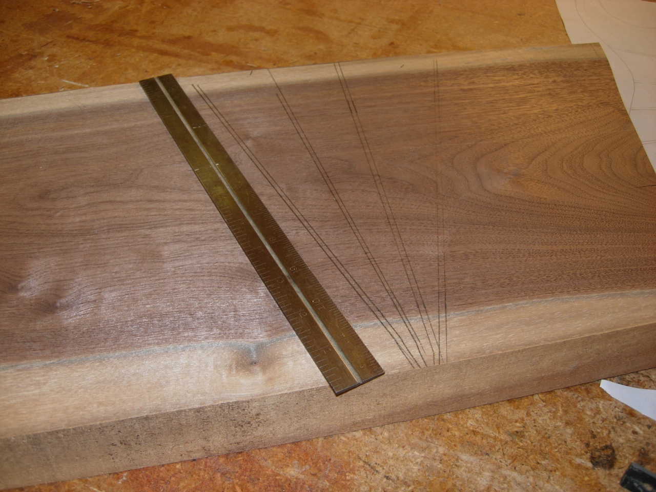 While I am working on the cabinet and starting to come down with a cold, I want to put a little time into another project for a fellow at work. He wanted to know if I could build him a modified Fender stratocaster guitar. I figured that I would at least try to find a piece of wood that would suit the project’s needs this weekend. He originally wanted mahogany, and for me to stick as close as I could to a classic 1959 model, but the more we talked, the more little tweaks he wanted. I spent some time this past week drawing up the new body. It will be narrower as well as a little more curvy than the original. We also decided to ditch the pick guard and mount the controls from the rear. I talked him into trying walnut, even though he wanted to use mahogany because it would be lighter. I figured that I had a pile of walnut, may as well try it. If it is too heavy, I can always make a second one and set the walnut one aside till I can afford parts to outfit it for one of my sons.