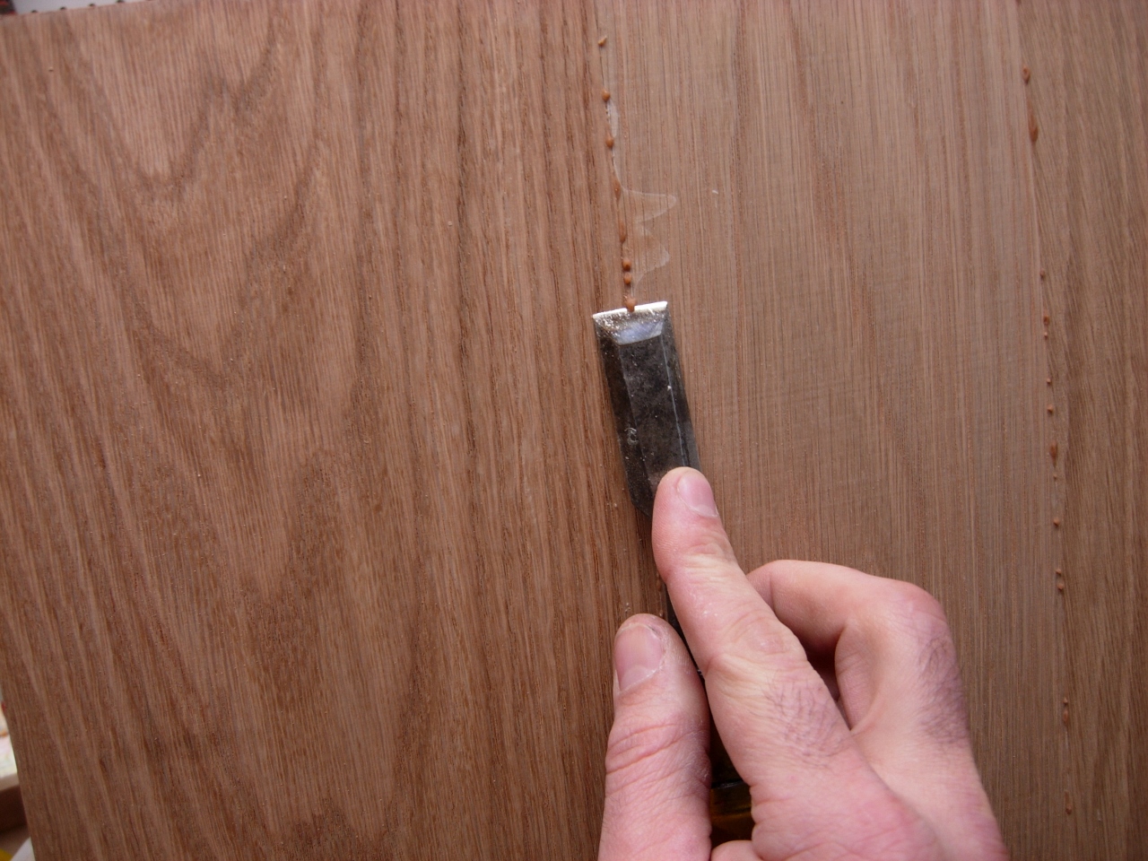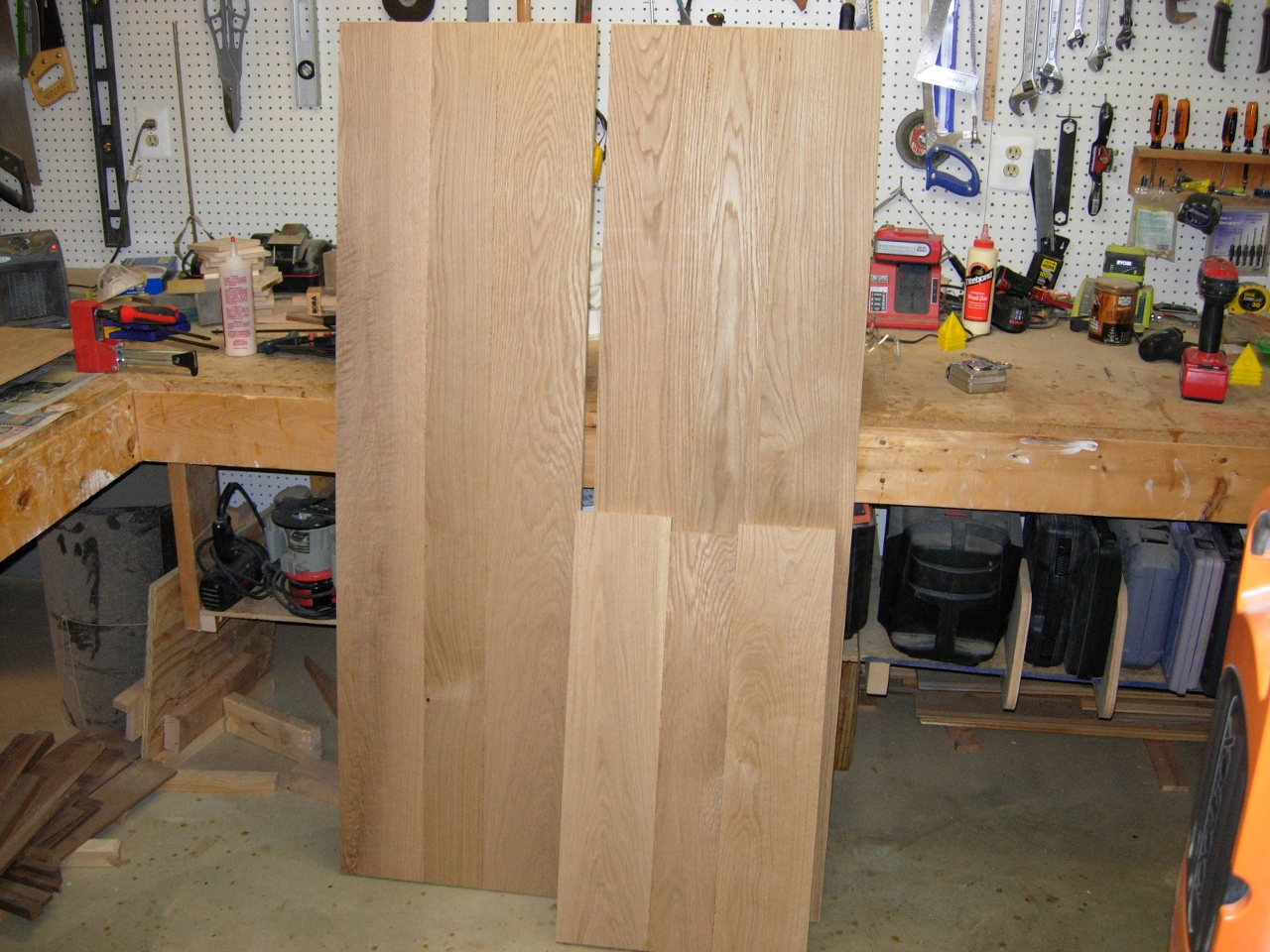 I didn’t get much accomplished today. My little shop helper has managed to pass his cold on to me, and my energy levels are much lower today. This morning, I managed to unclamp the boards that I glued up last night. They were the sides and a board that will be cut into the top and bottom. Once they were out, I glued up the three pieces that will make up the door and the two for the back panel. I spent a few minutes scraping glue squeeze-out, but gave up for the day. A few hours later, I did pull the clamps off to free up the bench for my other project.