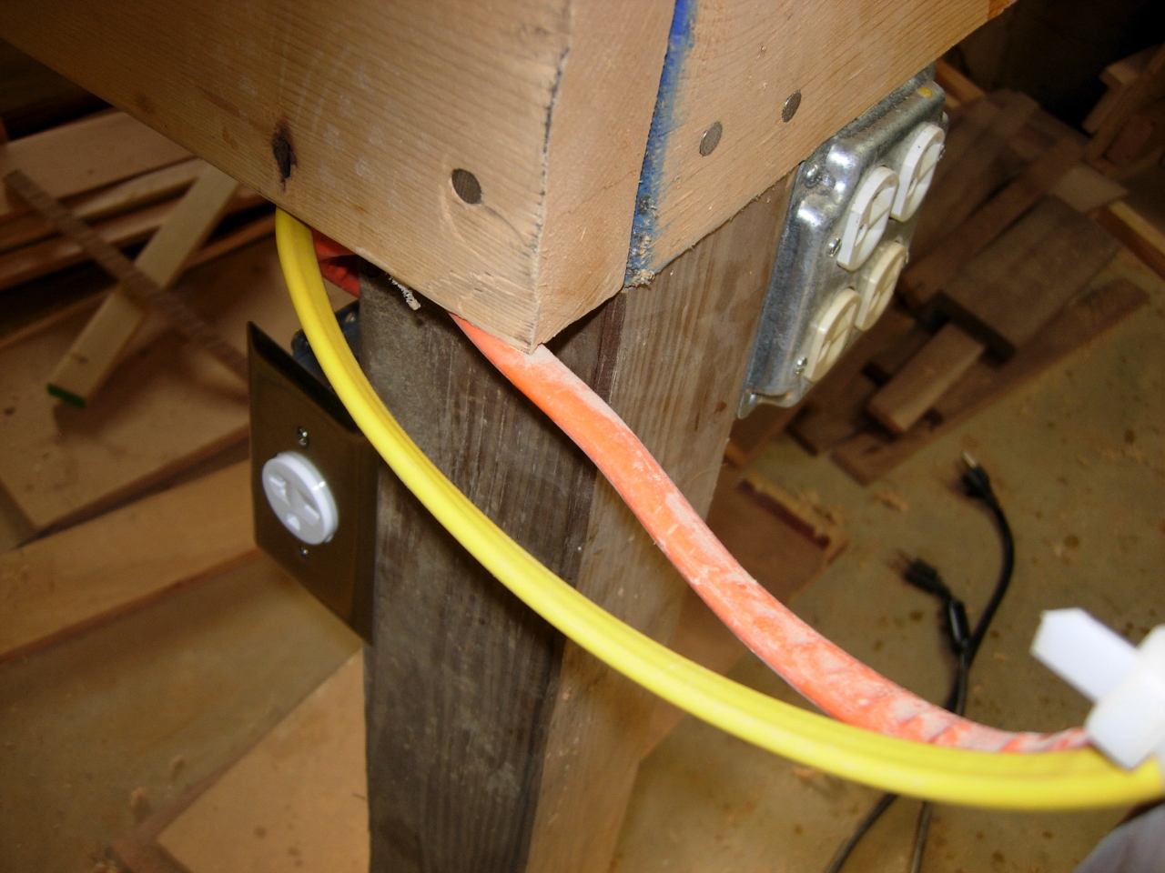 I used to run most of my tools from a quad receptacle under my bench. I had to put in a new box for the 220V receptacle, so the two new circuits will run to them.