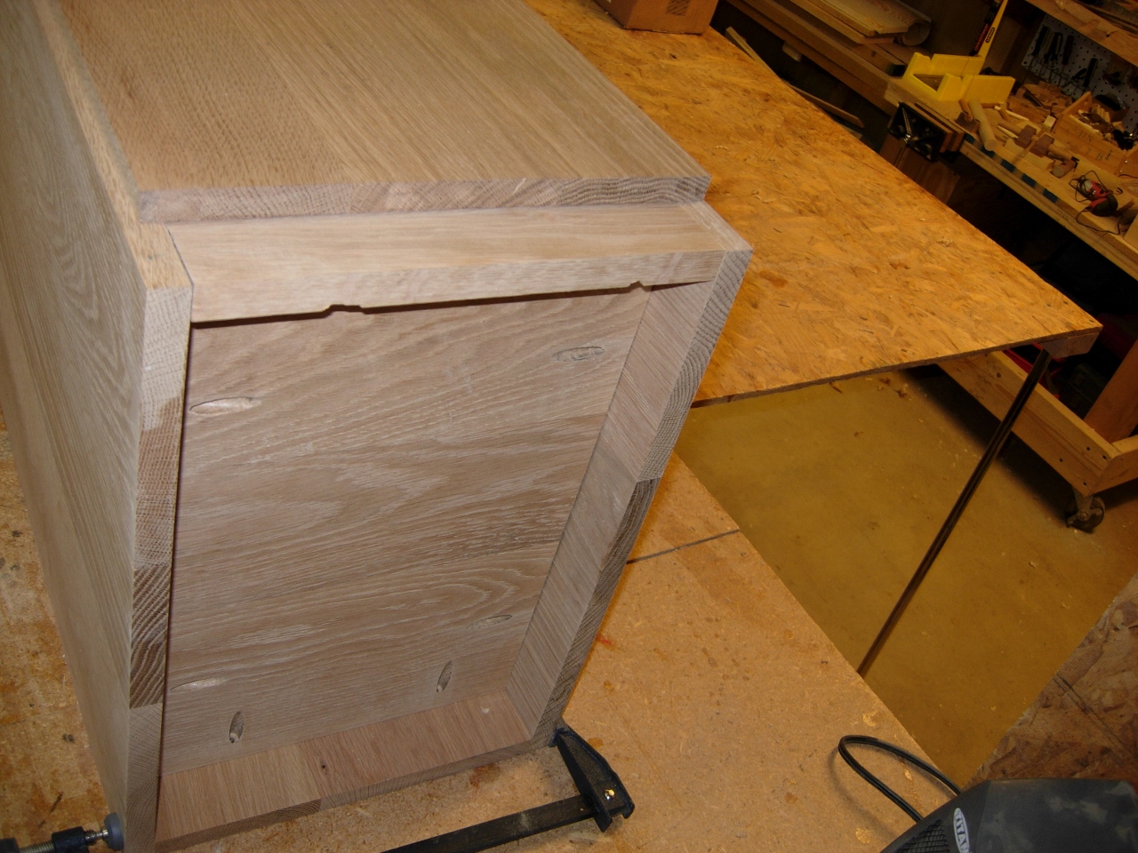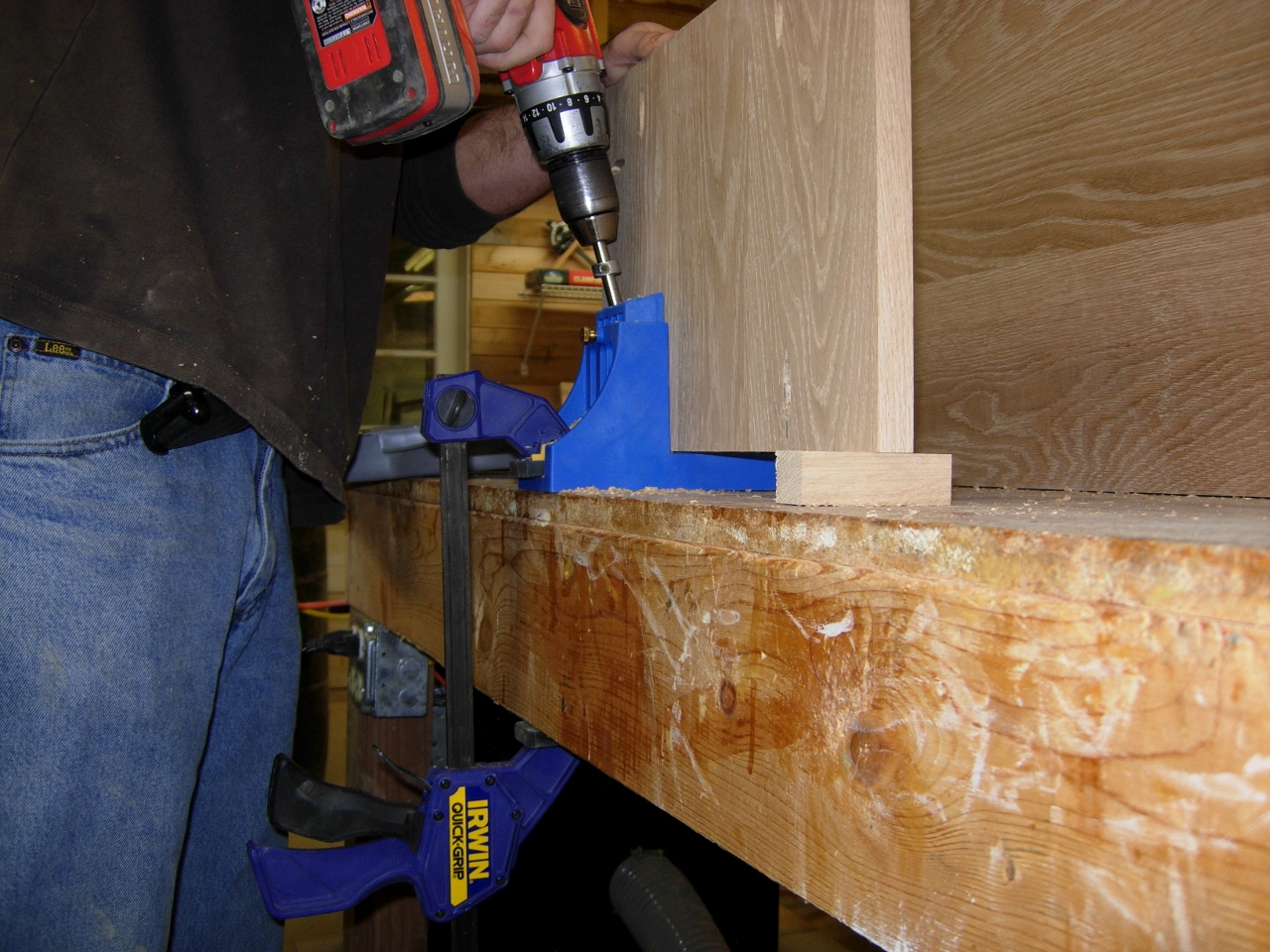 The evening did not start well. Not working from a set of plans is really becoming a problem. I cut the top and the bottom so I could do a dry-fit and check everything out. The top was 1-1/4″ too short so I quickly cut and planed a strip to add to the top. While that was glueing up, I started on the bottom. I drilled pocket holes and added a 2″ kick to the front. I managed to break the brad point off my drill bit for the pocket hole jig, so that ended that. I then decided to move on to the door. I did a test fixture to check the hinges that I had purchased for this door. They, of course, did not work as planned. I purchased the same ones that I used on the sacristy cabinet. That door was a flush mounted door and this one was to be a half overlay door. So I finally decided to give up for the evening. I placed an order for the new drill bit and hinges at Lee Valley then sat down to do this post. I had hoped to finish the cabinet this weekend, but it looks like I will have to wait for my package to arrive first.