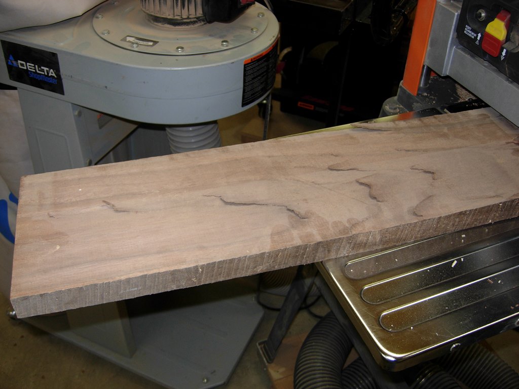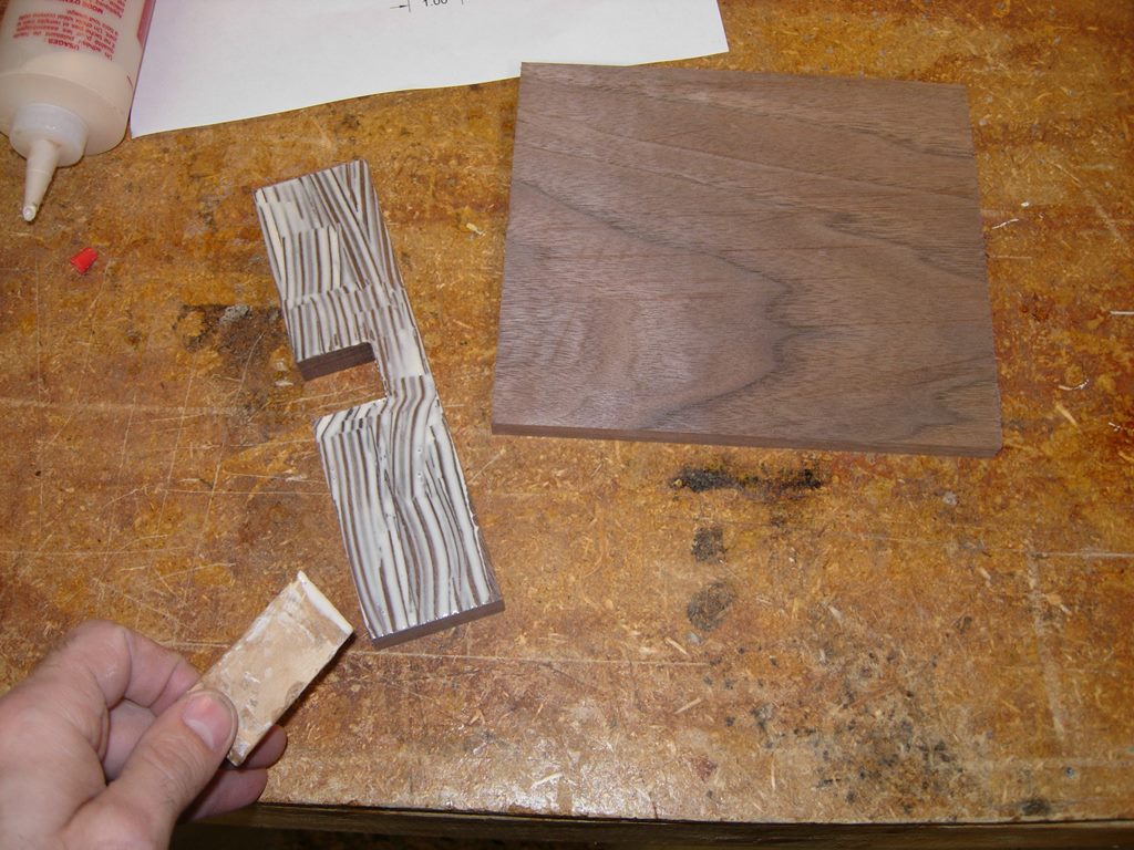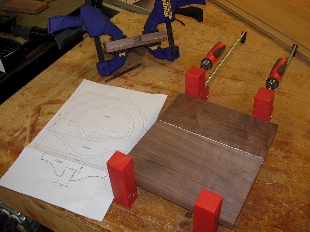 I started another project last night. The other two projects are waiting on hardware, so I started one more. I have a co-worker that hunts and likes to mount trophies. He asked me if I could make a mount for a turkey fan and beard. Yes, apparently some turkeys grow a beard, usually the males. I attached the pattern that I designed to meet his specs. It is a simple design, there is a large back piece that the fan mounts to, then a spacer with a notch for the beard, then a front plate to cover all the unattractive bits of the feathers. I rooted around my scrap pile for some walnut and came up with this ugly piece of sappy wood that was peeling badly. I planed it down 1/4″ till I got past all the peeling, then cleaned up the edges on the table saw. Next I cut that board in half so I had a front piece to match the visible portion of the back. I planed down another 4″ wide piece of scrap to join to it so I could make the back tall enough to support the fan. A 3/4″ x 2″ wide piece of scrap would act as a spacer. I cut the beard notch into the spacer and traced the bottom curve onto it. This will enable me to cut that curve with the face side down when it is glued up. With that done, I glued up the back piece and the front/spacer assembly. Hopefully I will be able to finish the project tonight if I get an hour or two in the shop. If you find the plans useful, please leave a comment and let me know how yours turned out.