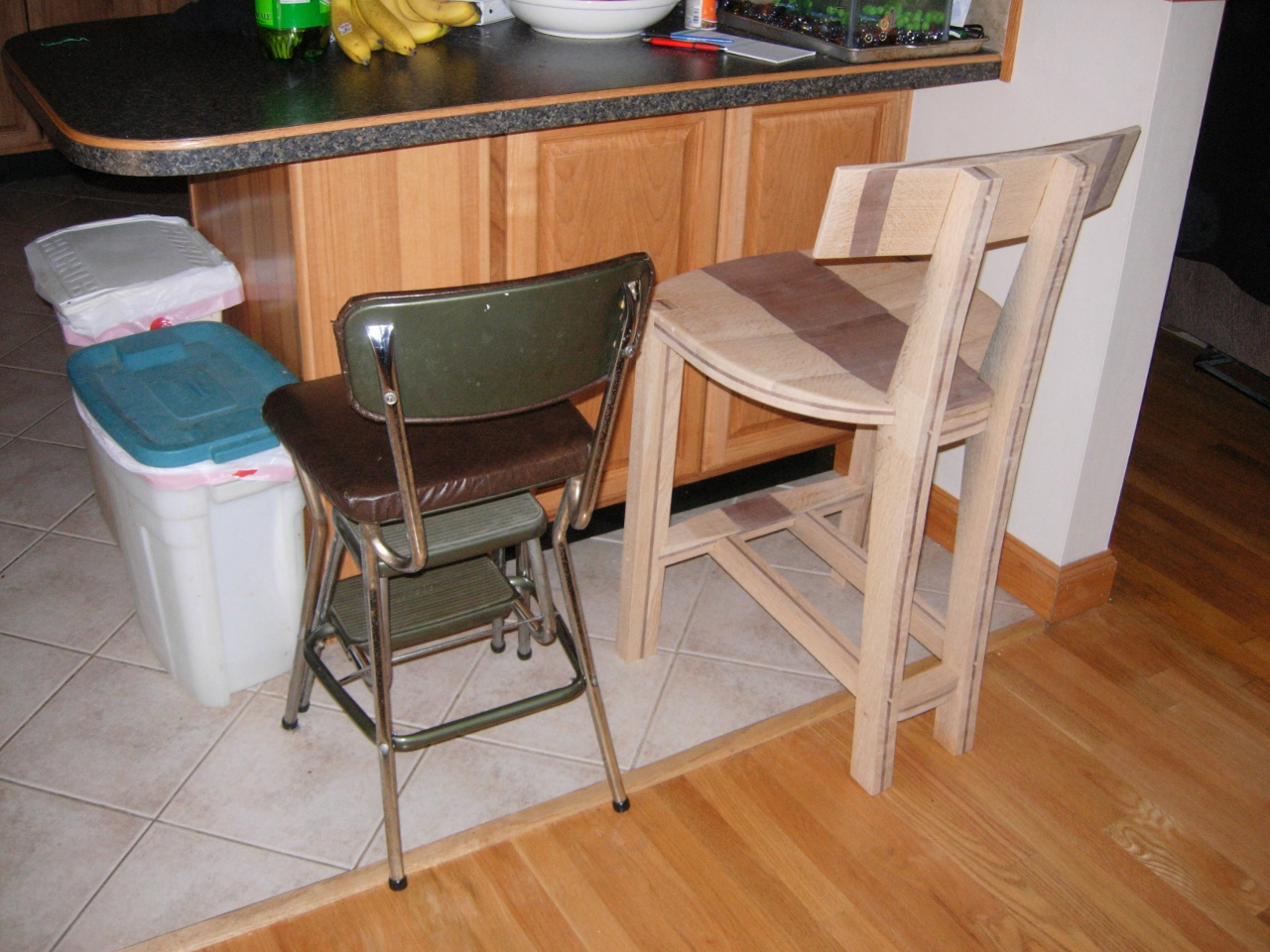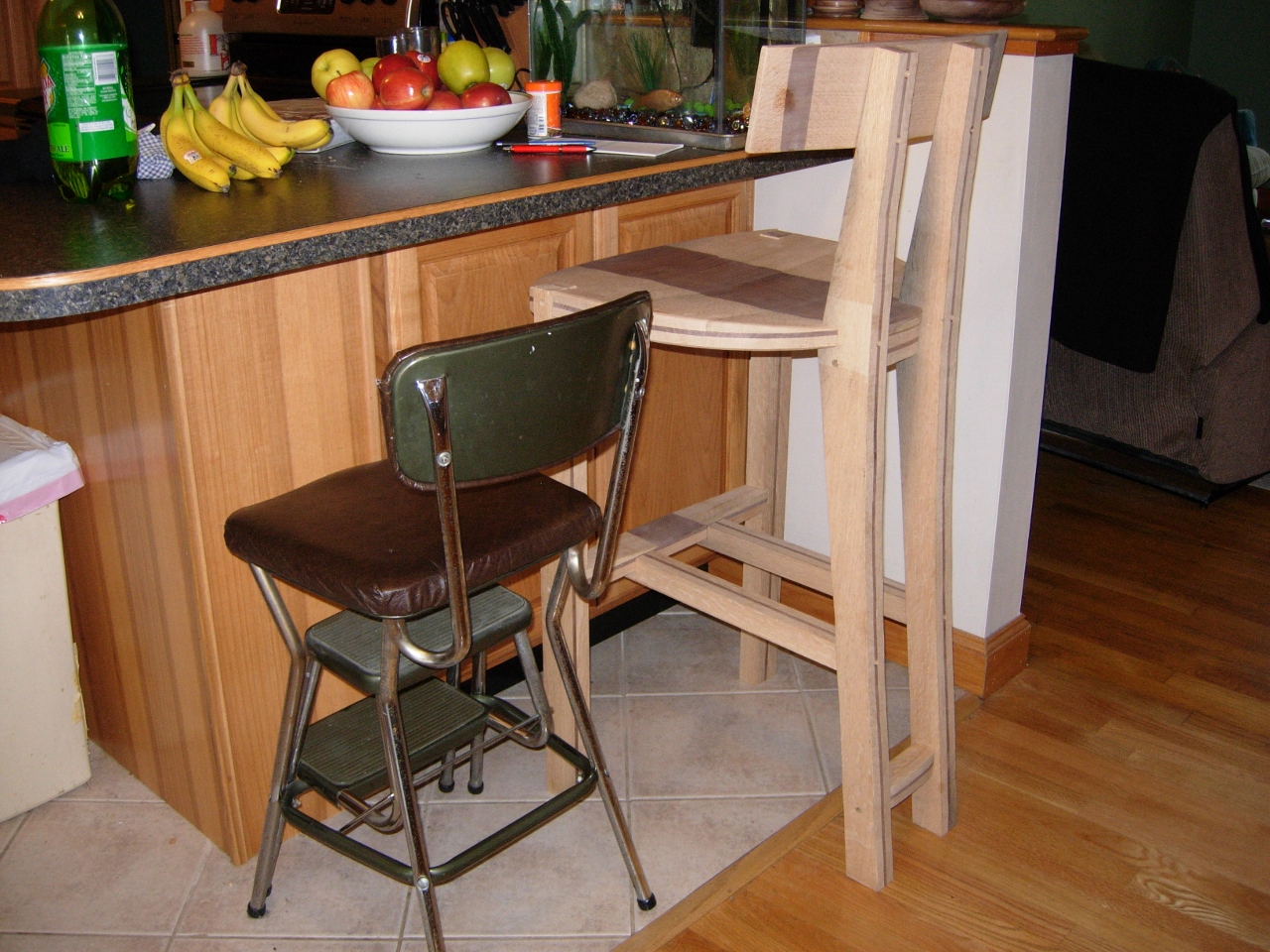 It occurred to me that the people from wood magazine may not have measured my kitchen counters when they put the plans for this chair into their magazine. I thought it might be a good idea to bring the stool upstairs and set it at the counter, just to test the height. I am glad that I did. My existing stools are a good 8″ shorter.