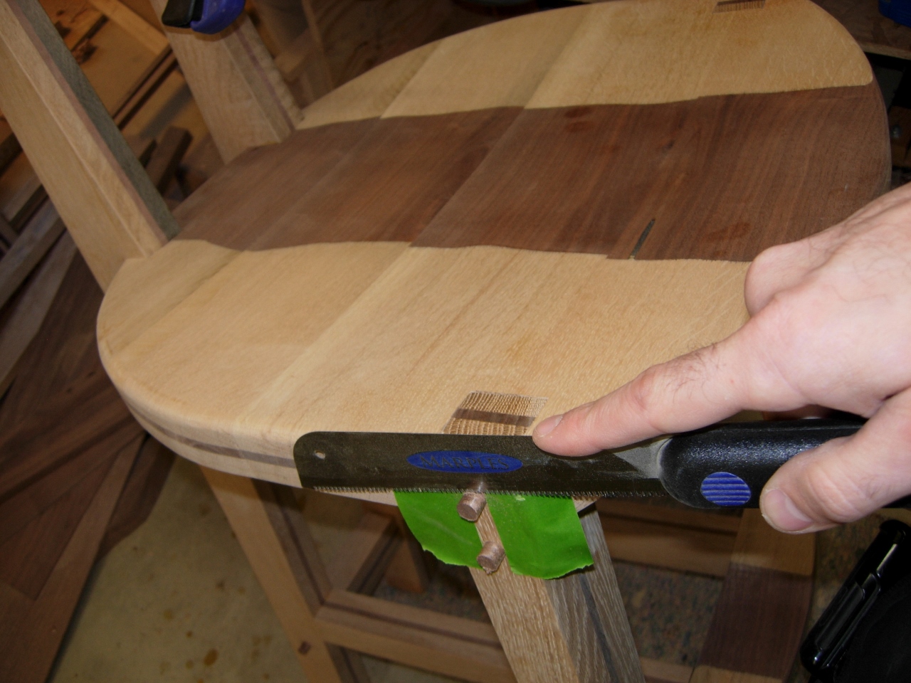 With a little painter’s tape on either side of the plug, to protect the wood, I cut off the excess plug material.