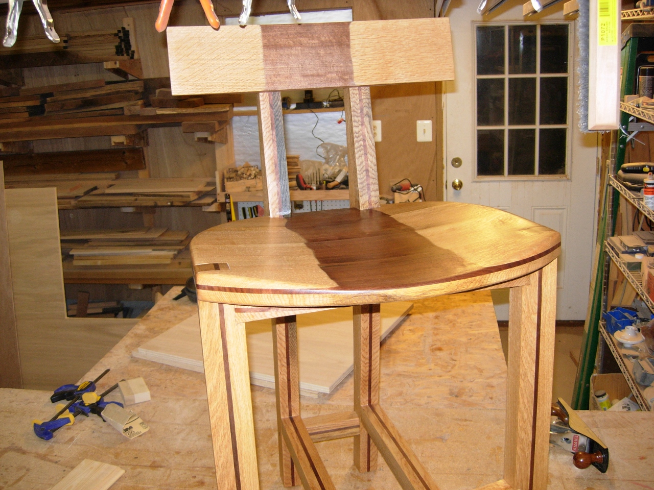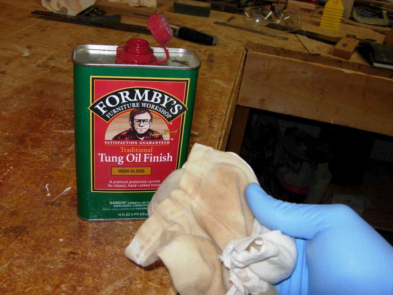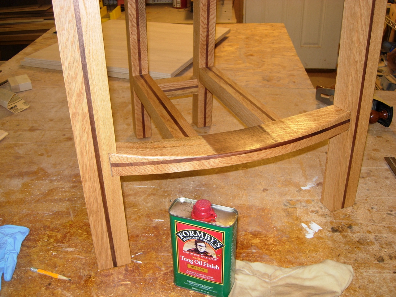 I had a chance to start finishing the chair last night so I applied the first coat of Tung oil. I decided to use tung oil because it a wipe-on finish that won’t run if you apply it correctly. I put 6 coats on Ian’s guitar and it turned out very nice. It is not pure tung oil, but a polymerised version. It soaks into the wood creating a hardened finish that starts below the surface. The more coats you apply the stronger and shinier it gets. I will probably apply half a dozen coats to give the chair a good durable protective surface.