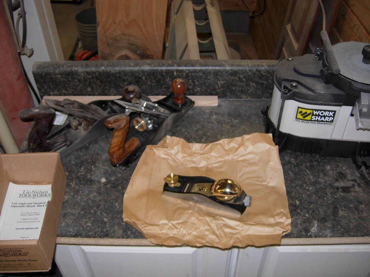 Today I received my new Lie-Neilson 60 1/2 Low Angle Adjustable Mouth Block Plane. Unfortunately I am very busy today so I just wanted to take a picture or two to post. I clamped up a piece of 3/4″ red oak for a test cut. Straight out of the box, it cut pretty well with the grain, Not so well on the end grain. I still have to sharpen and hone the blade, but that will be tomorrows project.