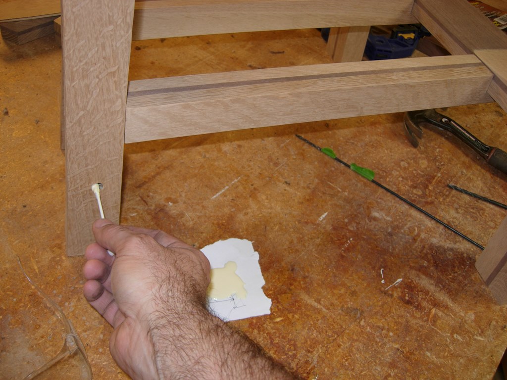 To attach the plugs, I apply a thin film of wood glue to the inside of the hole with a Q-tip.