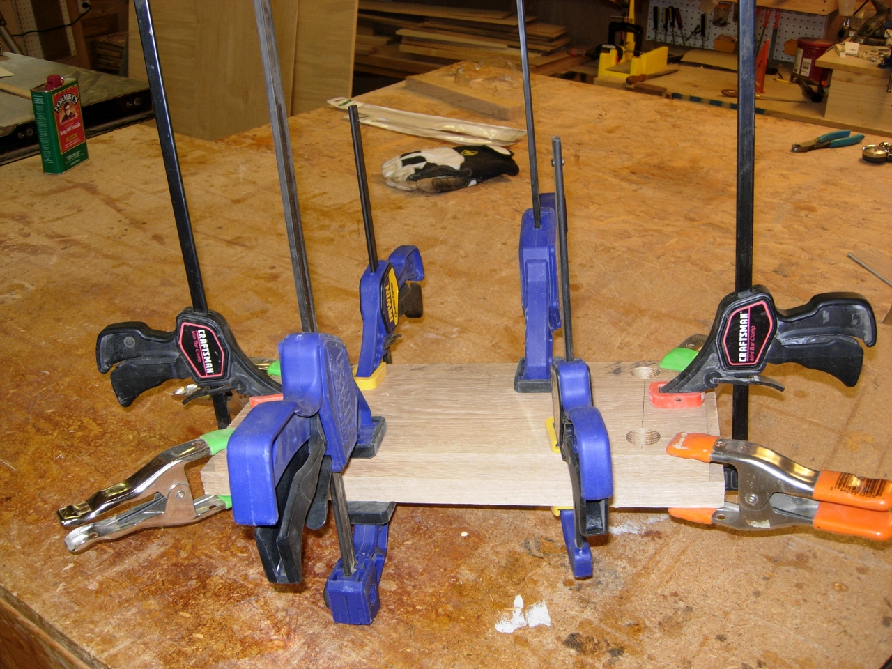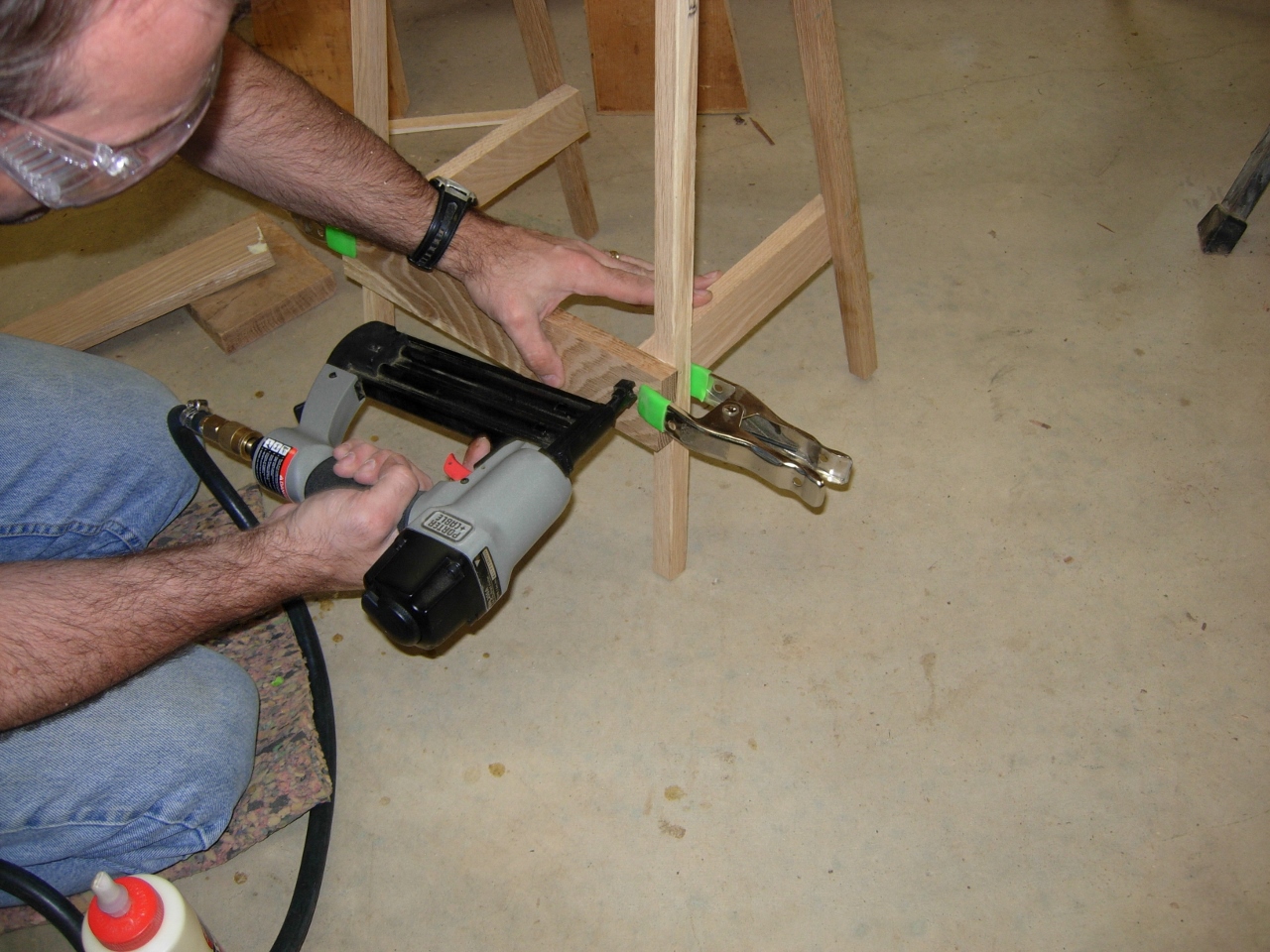 When they were clamped, I got out my nail gun and shot a couple of 1-1/4″ brads in to hold the braces till the glue dried.