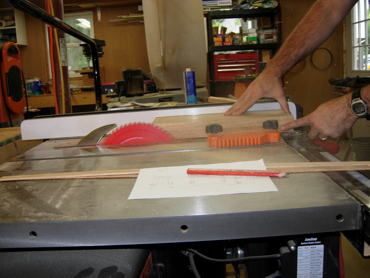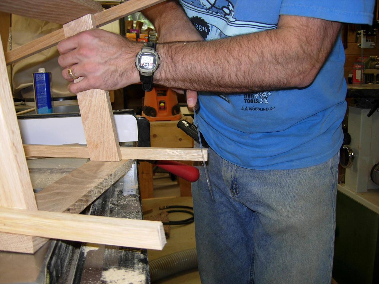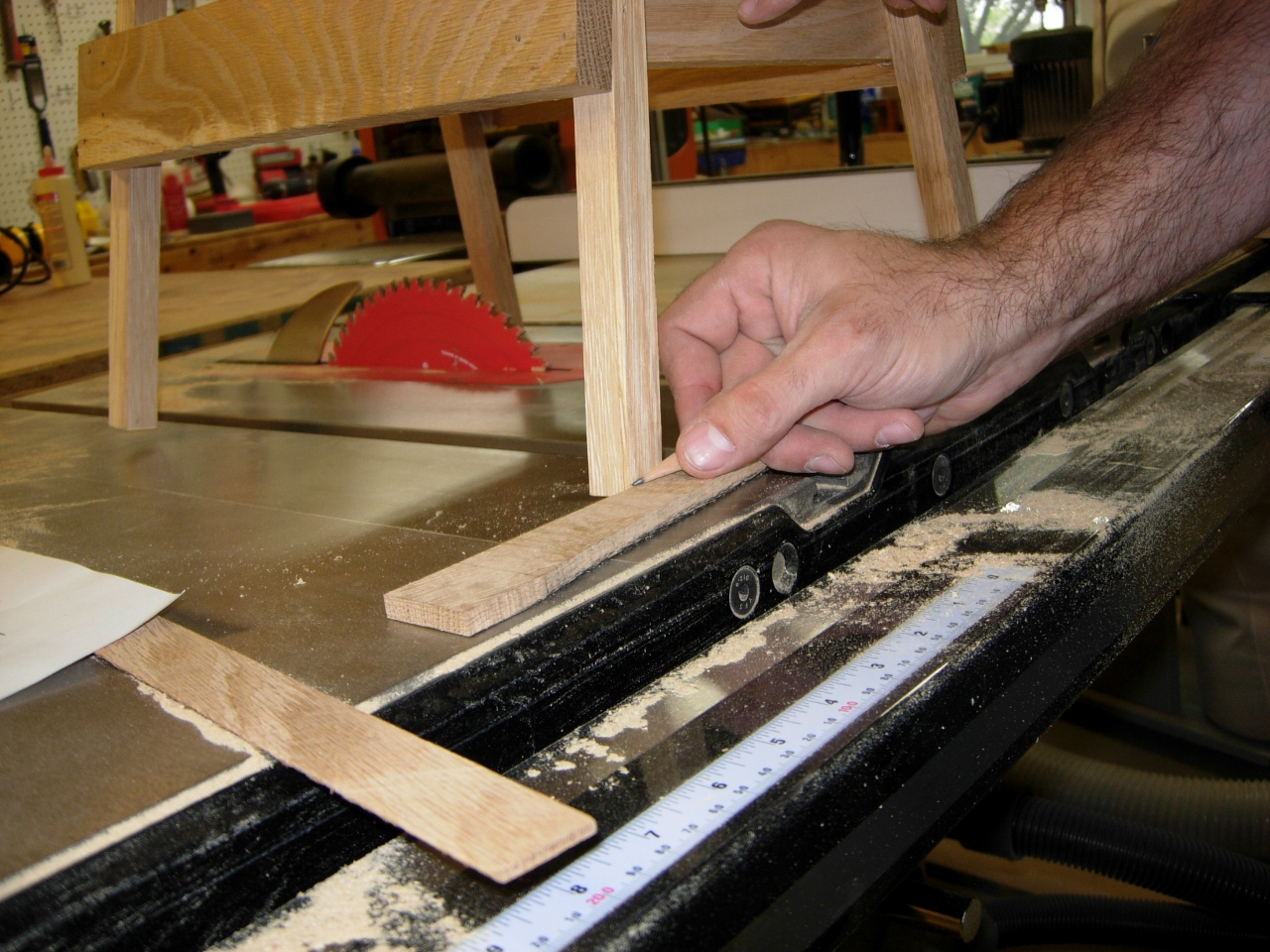 While the glue was drying on the seat, we reassembled the legs and determined what height and angle we wanted for the lower braces. We held them about 6″ off the floor. After marking the side spacers, Adam cut them down on the bandsaw.