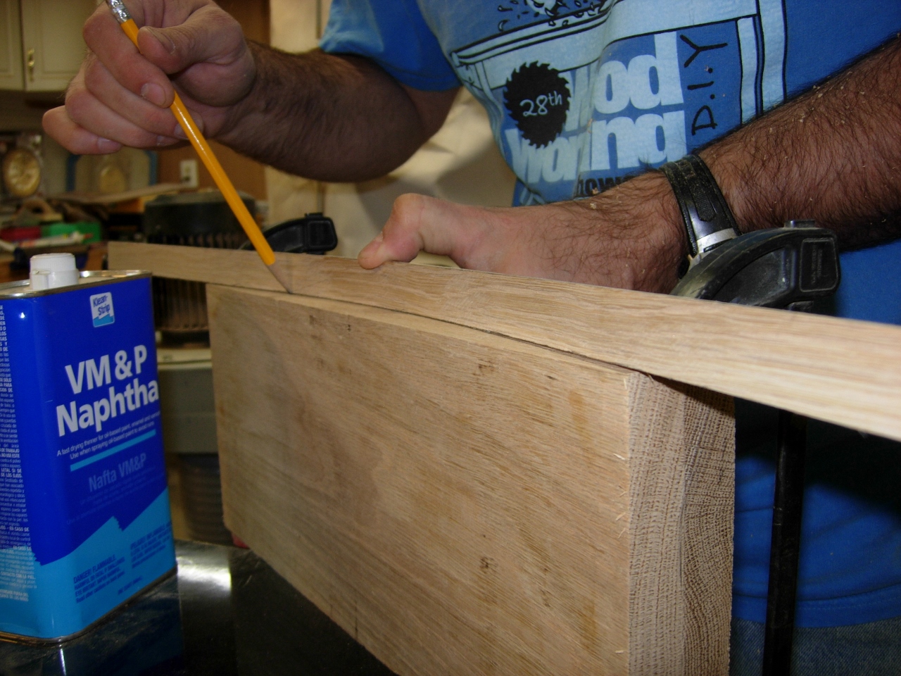 After an hour or so, the glue was dry enough to continue working on the seat. I cut all the sides flush on the miter saw and the table saw. Next I laid out the arc that would define the curve of the seat.