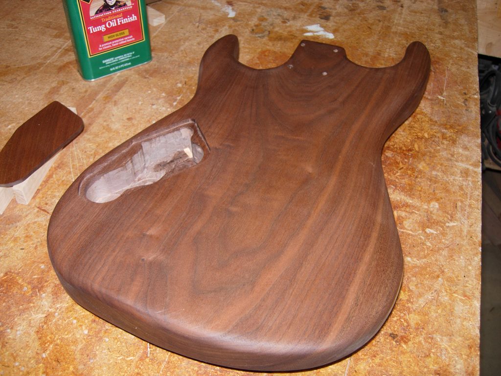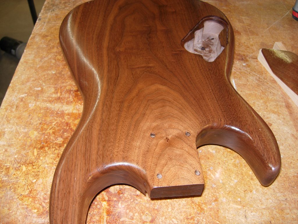 Since the finish soaks in, not much dust gets stuck to the outside of the guitar. Instead of sanding the first coat down, I am going to try just a simple rub-down with a piece of a brown paper bag. That is usually what I use to polish the final coat, but it seems to be enough to smooth things down.