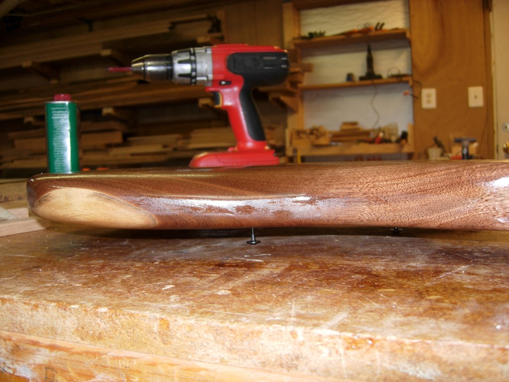 The first coat of tung oil has dried. It soaks in pretty deep, so you don’t get much of a shine until the third or fourth coat.
