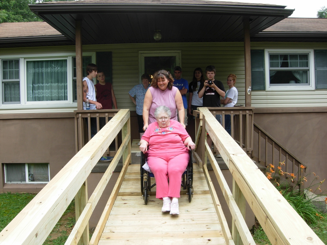 I ran a small crew that consisted of three adults and six teens. Our project was to build a 40′ long wheel chair ramp for the home owner’s Charles and Sandy. We usually supply all the materials and labor on these trips, but Charles insisted on paying for all of the materials. My design for this ramp is also in my last post. Everything went nearly as planned. We ran into a few problems with large rocks getting in the way of our hole digging, but the teens in my group kept at it until all the holes were dug. Most of them, including myself got a few blisters, but not one of them complained.