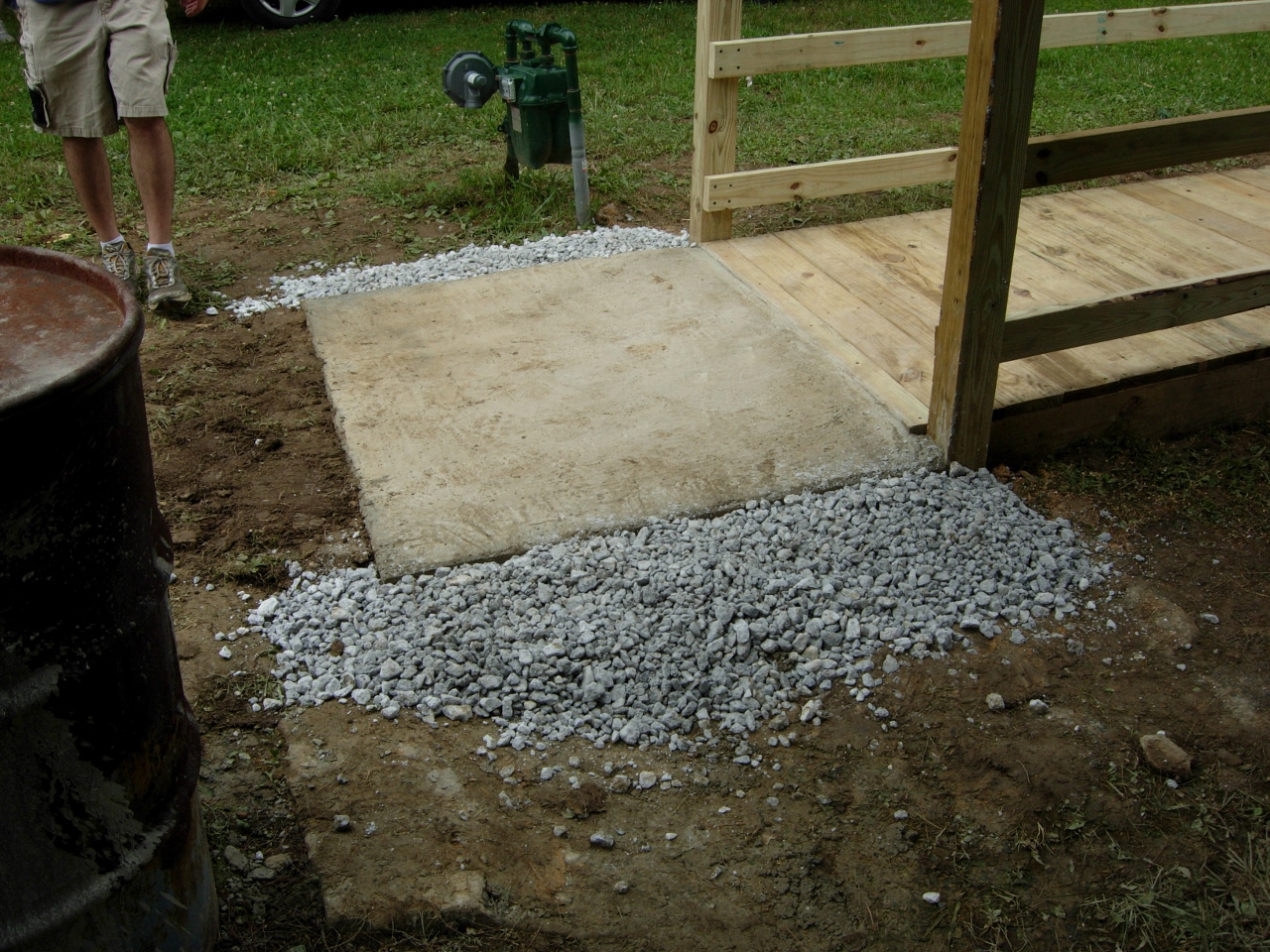 We had rain every single day that we worked. Day one, we got the holes dug and the posts set. I believe we even managed to attach the two runs of joists along the posts. Day two, we finished the joists and blocking, and got half way through the decking. Day three, we finished the decking, poured the concrete pad, and attached the rails. In case you were wondering how much concrete the kids had to hand mix to do that pad, it was about 1,100 pounds. Six 80 pound bags and twelve 50 pound bags of quickcrete. Day four, we converted the section of railing, that we removed, into a gate, and built a ramp for the front door step. Then on day five, we replaced some rotted boards on the garage door jambs and wrapped them in aluminum so nobody would have to paint them again. My crew worked non-stop the entire week and managed to have some fun while learning a bit of carpentry.
