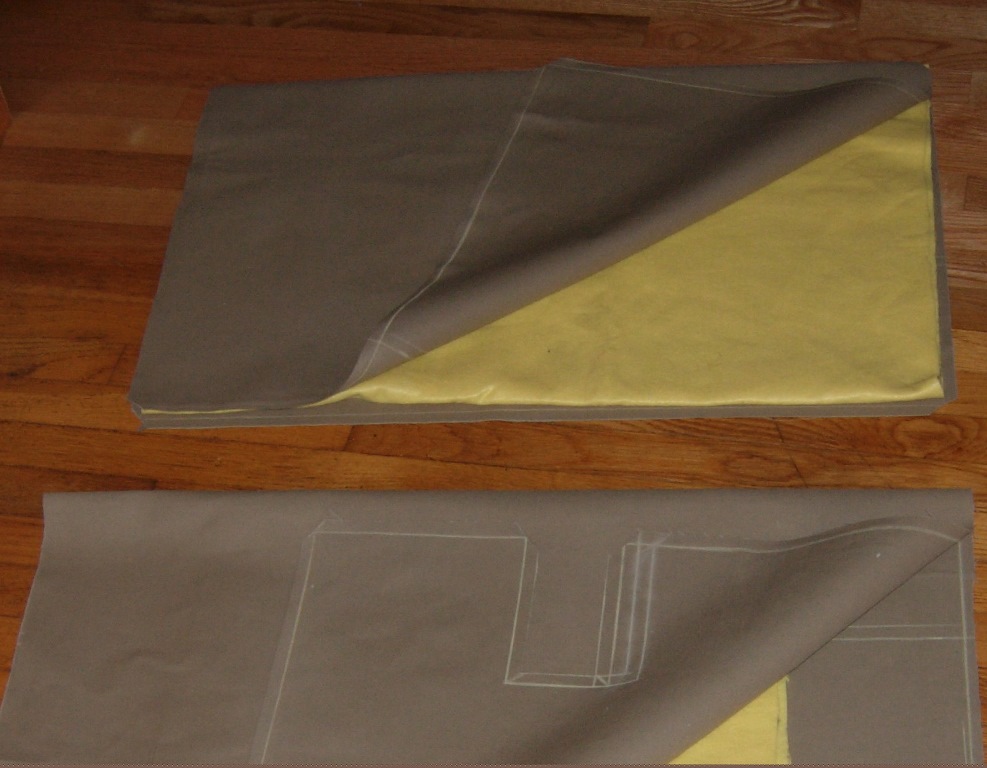 I Purchased 2 yards of duck cloth from a local fabric store. The dimensions were 60″x72″, Just large enough that I can double up the material and fill it with a thin filler. My wife had a couple of yards of felt lying around, so I snagged some for filler and doubled that up as well. I took my time laying out the pattern with my framing square, then cut it out. I did manage to start laying out the big piece in the wrong orientation (twice!), so just ignore the lines that don’t look like they belong…