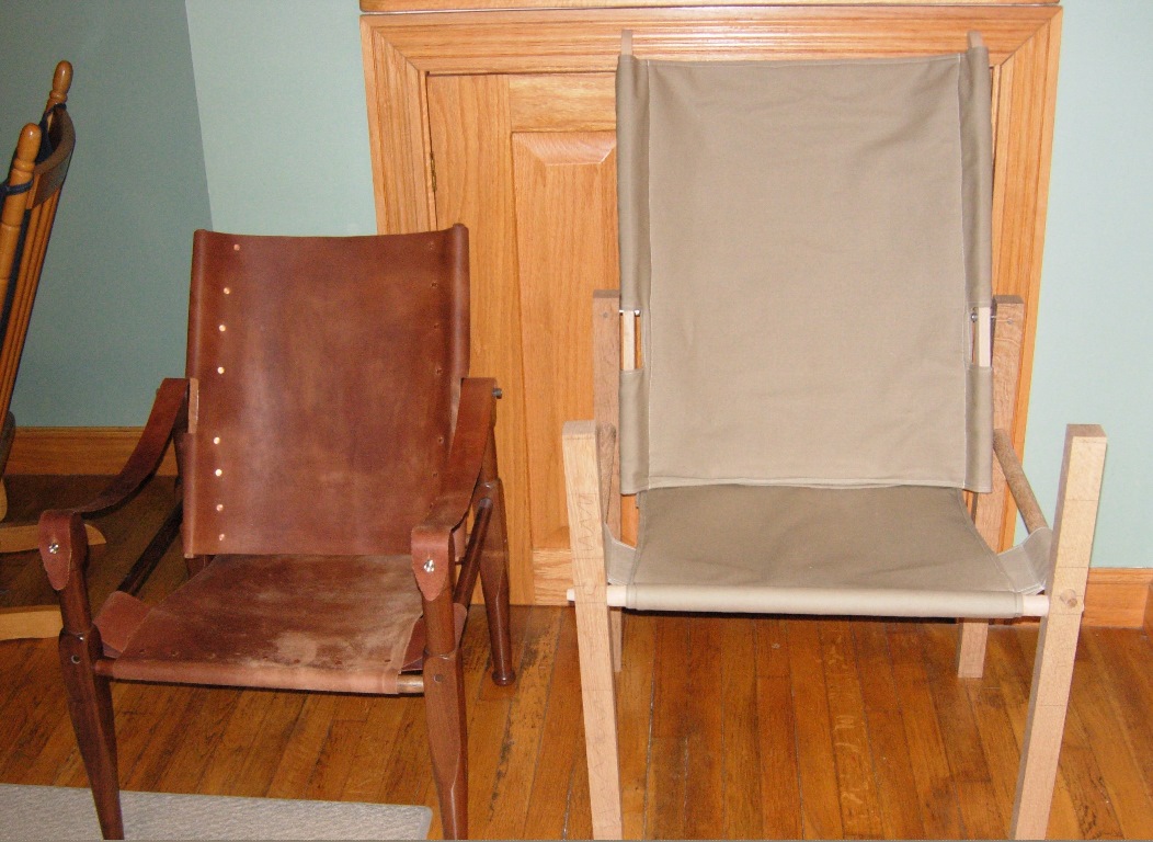 I folded in the 1/2″ seam allowance and pinned the fabric together, then handed it off to my wife to sew up the edges. With the three blanks sewn up, I wrapped them around the chair rungs and pinned them in place. After carefully disassembling the chair, my wife sewed the loops for the rungs. Everything seems to fit fairly well, but I can’t test it out too well untill I pick up the right length bolts to hold the back on. I have some short bolts holding it up at the moment.