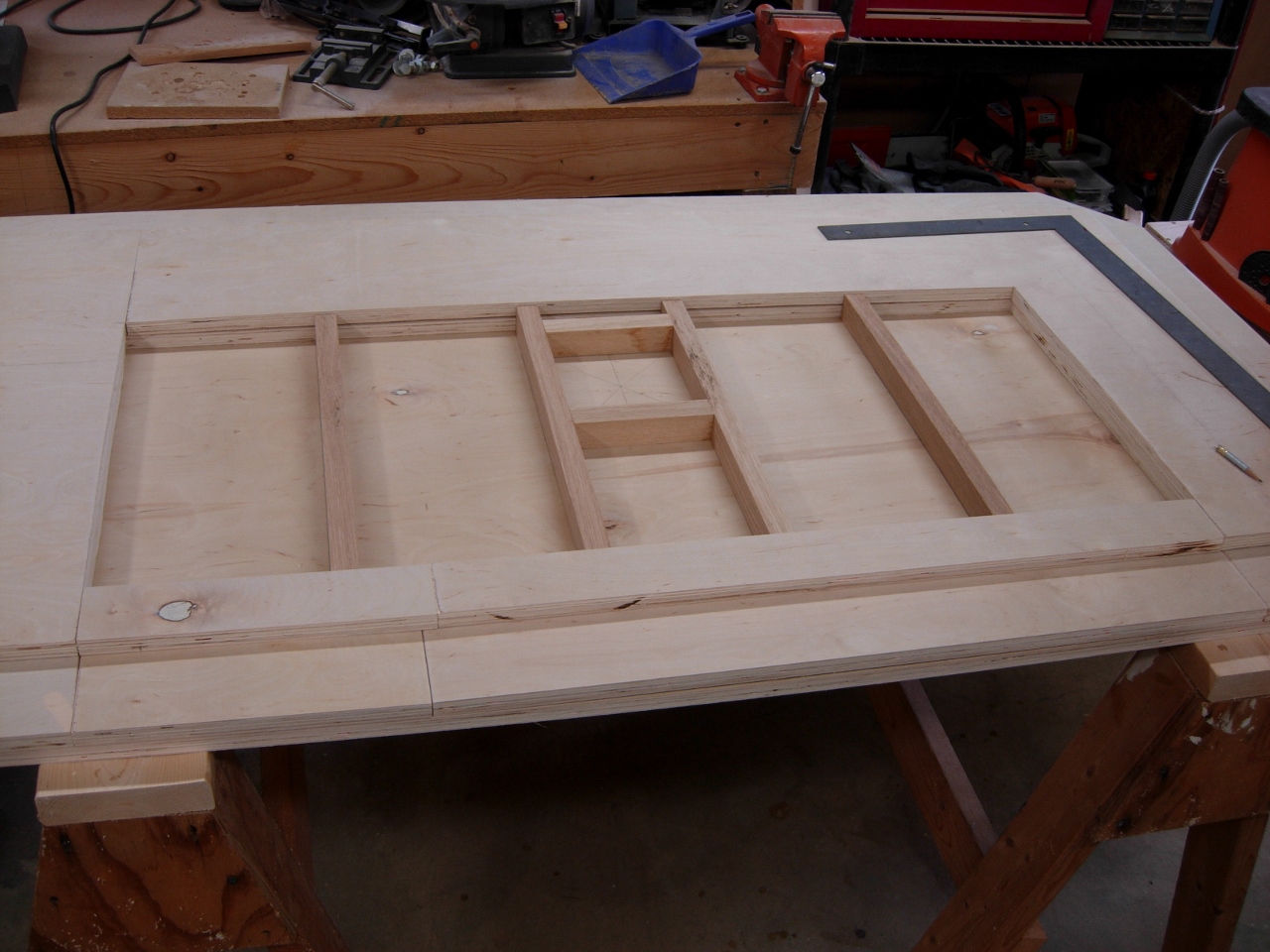 Before I can assemble the top, I had a couple of filler pieces that need to be made for the back side. I left them out so I could squeeze more out of my sheets of plywood. Basically I cut some 6″ wide scrap and 2-1/2″ wide scrap left over from my 3/4″ plywood to back-fill. It isn’t critical that you can see the plywood butting together because all of it will be getting covered with veneer or edging eventually.