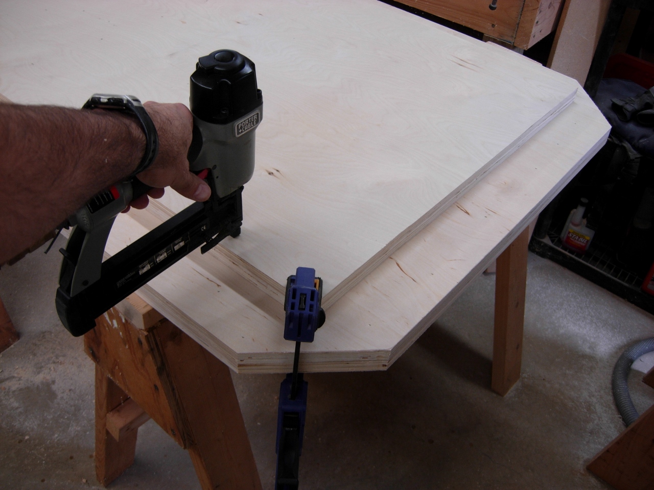 Next I glued up the two layers that make up the bottom half of the top and nailed them together as well. With both pieces assembled, I ran my router around them with a flush trim bit to line up the edges.