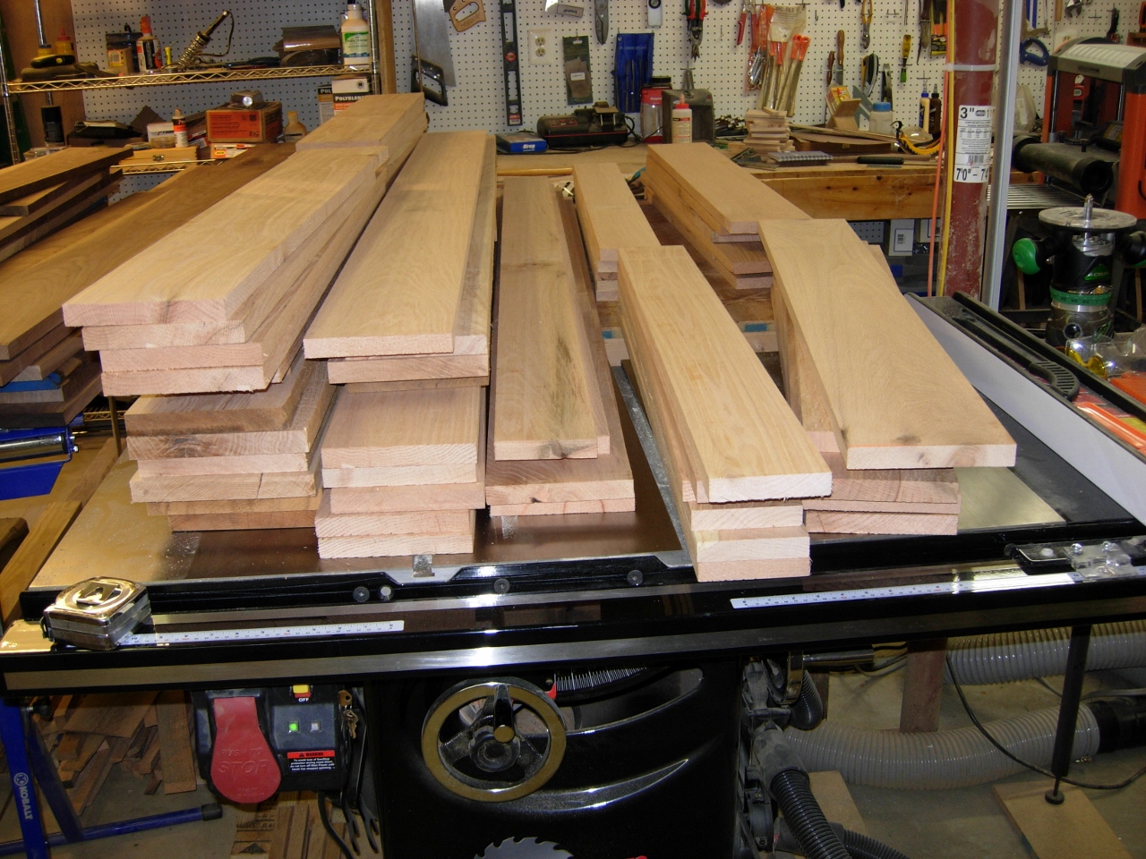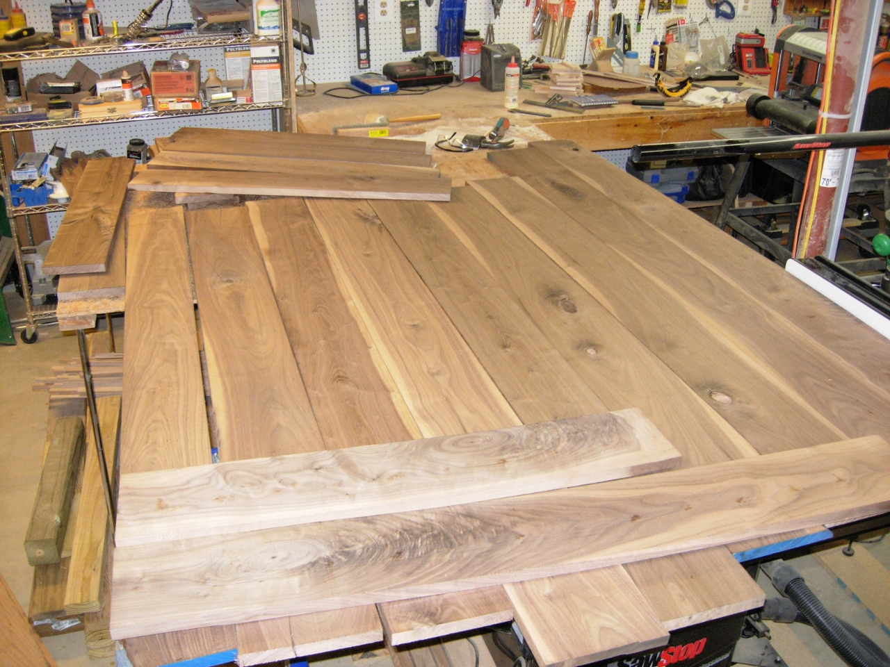 It has been a busy week so far, but I was able to get all of my wood for the project. The majority of the wood was donated by Alex Grabenstein at Vintage Lumber in Woodsboro MD. The rough material list, that appears in my plans, is geared toward the wood dimensions that Alex can supply me. Most of the wood he gives me is cut and planed to the dimensions required to make varying widths of hardwood flooring. For the 6/4 (1-1/2″ thick) boards used on the base, I had to go to my friend Dave at Saint Joseph’s Carpentry shop in Poolesville MD. He cuts and dries his own domestic lumber and lets me come pick through it now and then. I found a couple of nice, straight , 12″ long boards that will be big enough to join together to make a nice solid base. I spent my time this evening, just sorting through the wood. The majority of the short oak pieces will be used to make the columns, and the vertical boards that will frame the raised panels. The 6′ long boards will be used for the horizontal panel frames, as well as veneer for the top. There are a few 5/4 boards that will be used on top of the 6/4 boards at the base, as well as the rounded cap piece that will go around the top. The walnut will be used for the raised panels as well as all the trim and the inlaid crosses. A lot of the walnut has some beautiful grain and sapwood running through it. It will look very nice in the trim and inlay, but will make it a challenge to join two pieces for the panels and make them look like one board. Since I intend to use a CNC router to carve something into the front panels, I will try to piece together the more solid colored pieces in the front, and maybe the more figured ones will be used on the side. I sorted through the pile and stacked it all against my wood rack so I could get my saw and workbench back. I will need both to cut and plane everything. Hopefully, I will get to that this weekend, but we will be taking my oldest off to college Saturday, so I am leaving my schedule open for now.