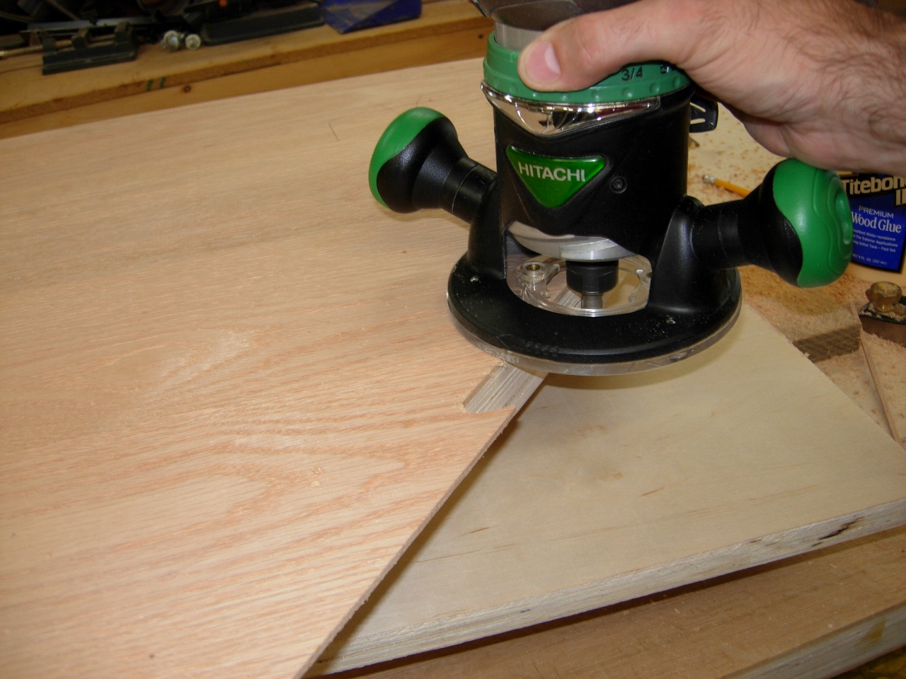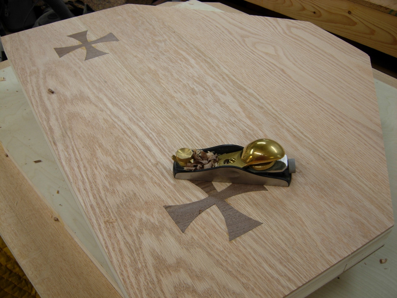 I trimmed all of the lip veneer with the block plane. Next, I flipped the board over and routed out the crosses on the front, then chiseled out the excess to make room to receive the crosses.