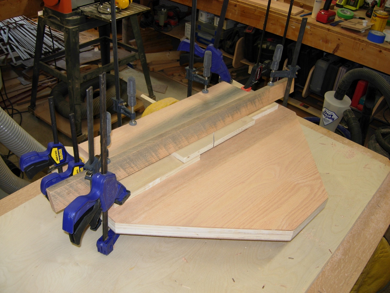 I took my time to lay out the angles so that the grain all went in the same direction. I cut the 45 degree angle on the band saw. The veneer doesn’t have to butt perfectly up against the plywood, that area will be covered with trim eventually. Once all the veneer was laid out, I glued and pin nailed it like all of the rest of the bottom veneer.