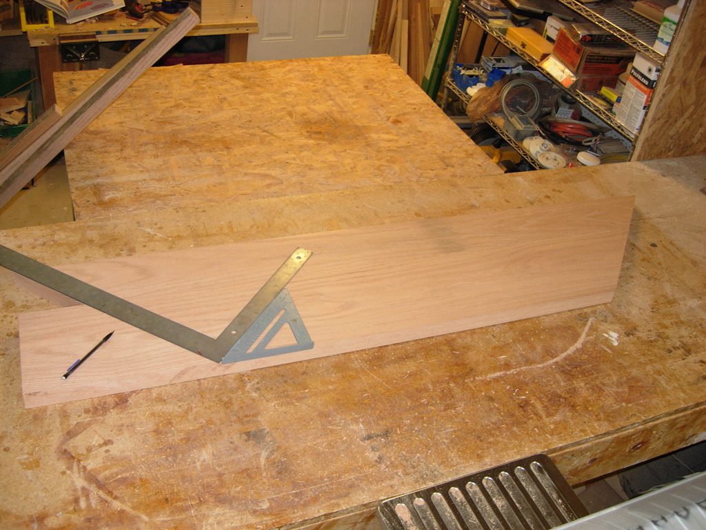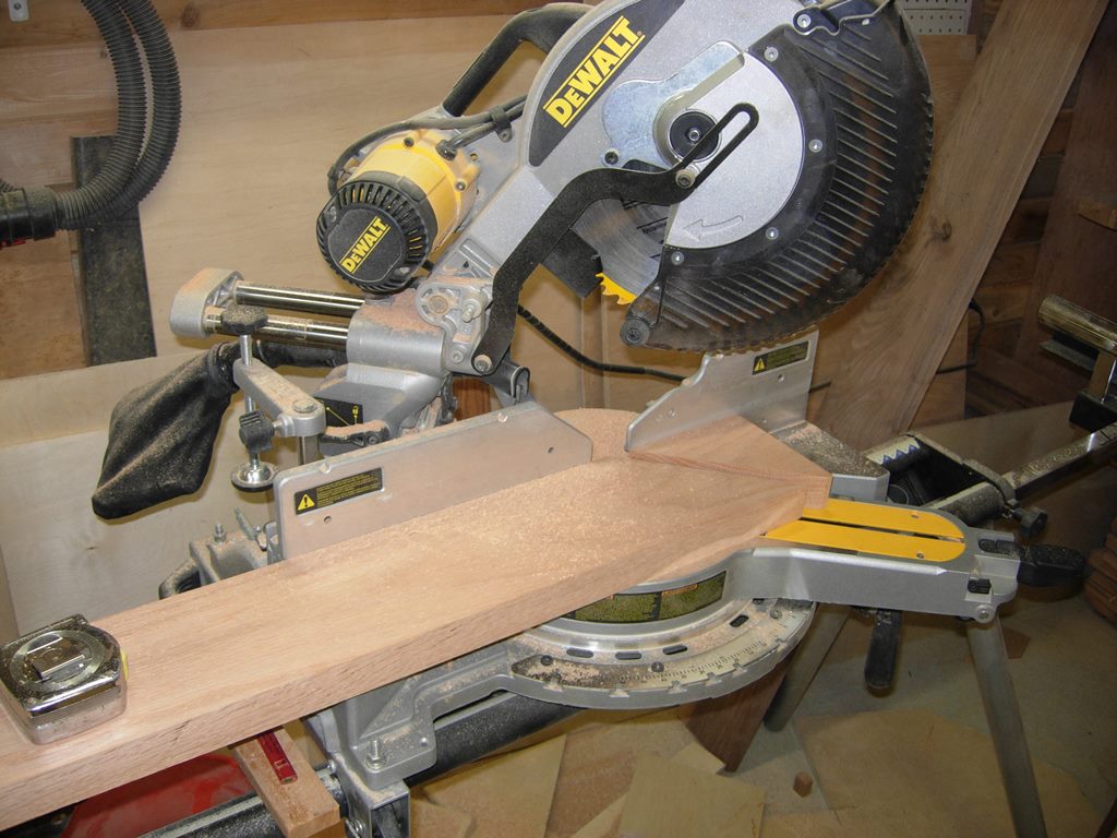 The big challenge for this base is the large miters on the corners. One of the reasons that I take on these big projects is to learn how to do these things. I know the overall dimensions of the base, so I cut the miter to the long dimension on the outside piece, then cut the first miter on the inside piece. Next I lay them together and use my framing square to project the second miter and mark it. After the front pieces are cut, I perform a similar operation on the sides. This would have been a bit more difficult with my old miter saw. The long 45 degree miter on the wider board would not have fit. I probably would have joined the boards then cut the miter with my circular saw along a straight edge. But the new sliding compound miter saw cut a perfect 45 with no problems.