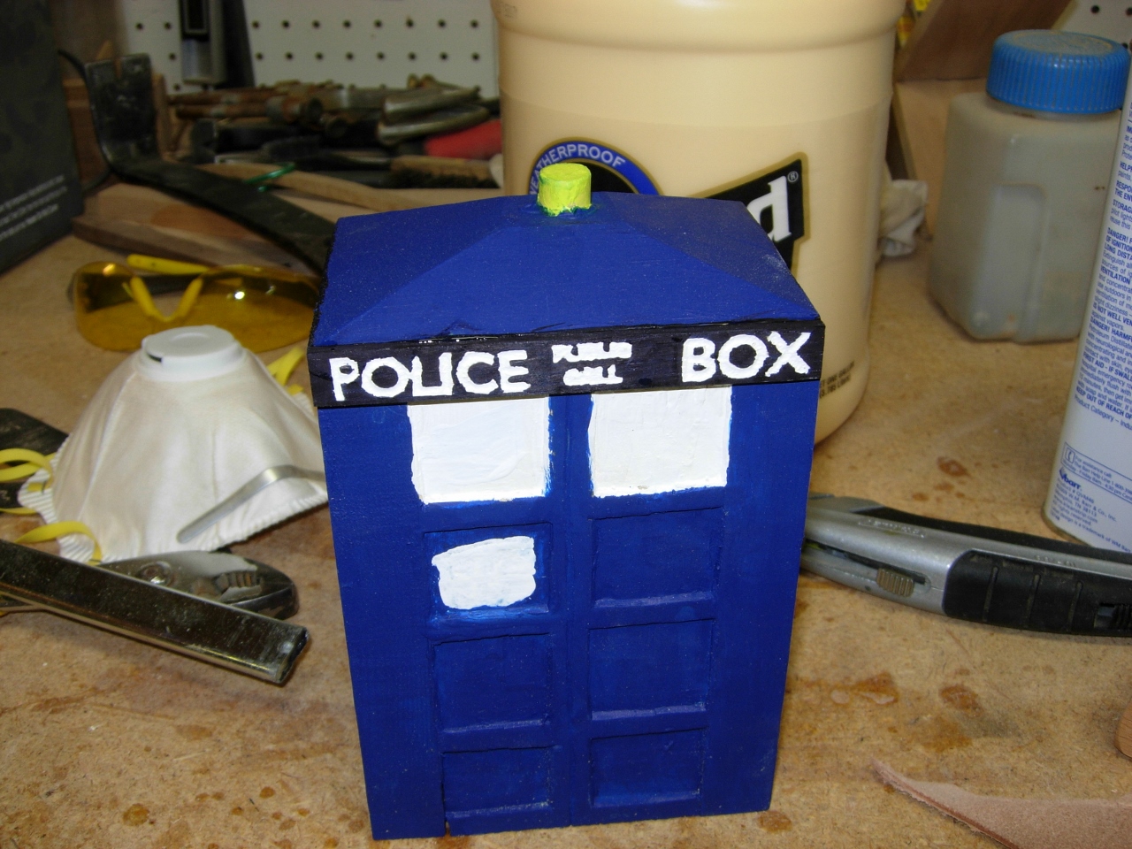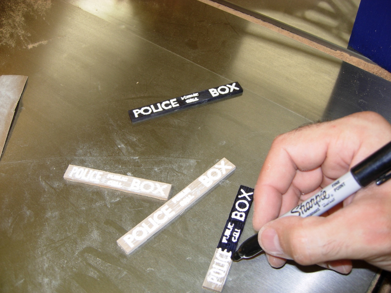 While I have been busy working on my altar project, Adam has been coming down to the shop and working on a project. He is a big fan of the Dr. Who series, so he decided to try building a Tardis of his own out of scrap cedar. For those of you who are not Dr. Who fans, the Tardis is a time travelling police box. He marked and cut the wood with a hand saw and a band saw. Then he planed down the edges with his hand plane. I helped him plane the angles on the top, but he did most of it by himself. Unfortunately I did not get any pictures of his project until he was almost done and asked me for some help. What he required was a small sign to mount at the top of each side that said “Police Box”. His thought was that it would be a good exercise for the new CNC router. So I took a few minutes to lay it out and brought it down to the CNC.
