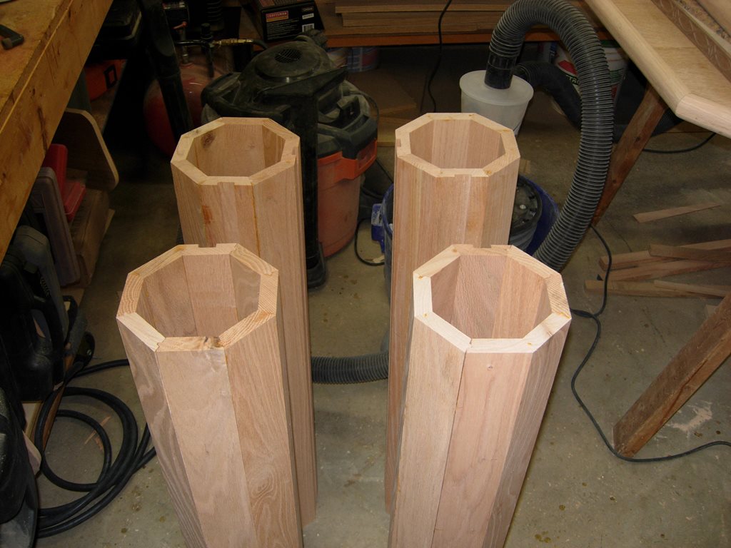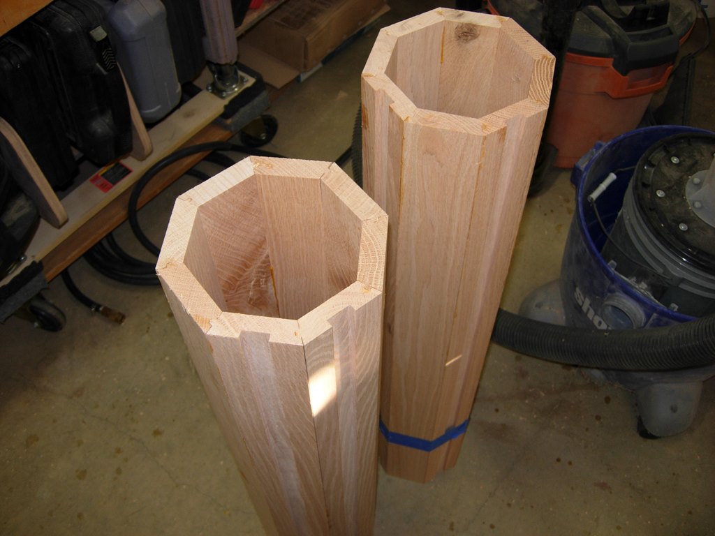 So, as I look at the two columns that I have so far, I realize that working till midnight has its drawbacks. My notches were supposed to be perpendicular to each other, not adjacent. I cleaned up the glue squeeze-out and ran the column across the dado cutter on my router table to put a dado in the correct slat.