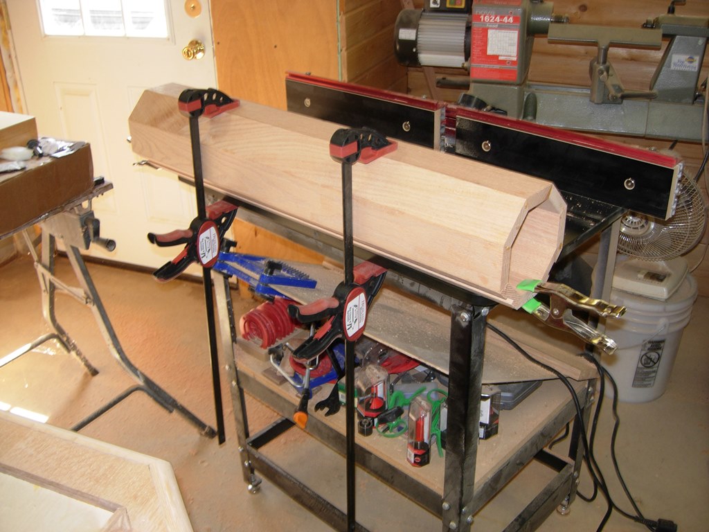 Then I grabbed a scrap piece of oak and cut it down to the size of the slot and glued it in place. I flipped the column over and clamped it to the router table. My clamps are not deep enough to reach the center, so this will have to do.