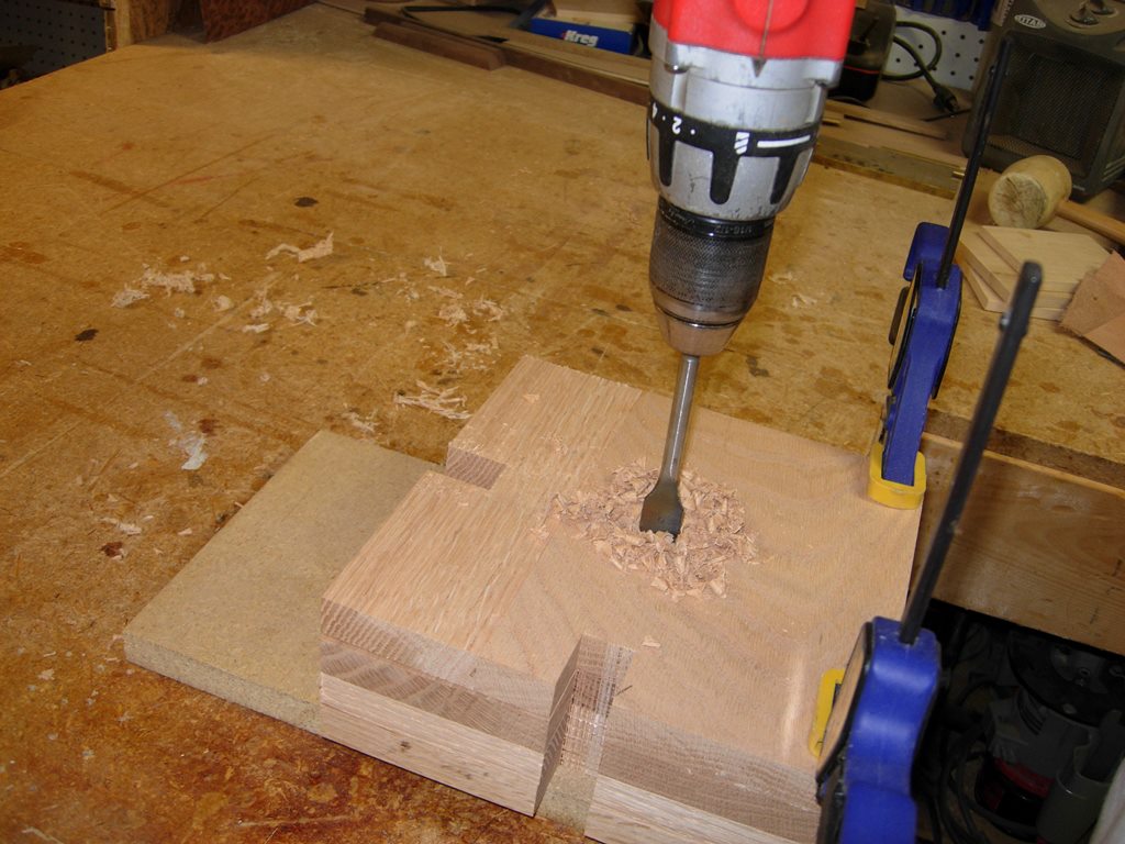 I intend to locate the columns with 3/4″ dowels, so I drilled a 3/4″ hole in the center of each cap, then located the bottom caps and clamped them in place. I match-drilled the holes into the base so they would line up perfectly. I intend to mount the dowel in the base at each center point and leave a short stub sticking up. I will then place one in the top of each column and drill a matching hole in the altar top.