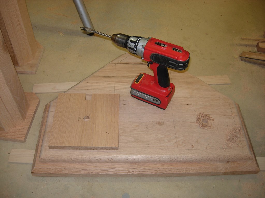 Holding the plates in place, I drilled a hole, about an inch deep, to accept the locating pin. With the plate still in place, I pressed a 3/4″ dowel into the hole, as far as it would go, and marked the top.