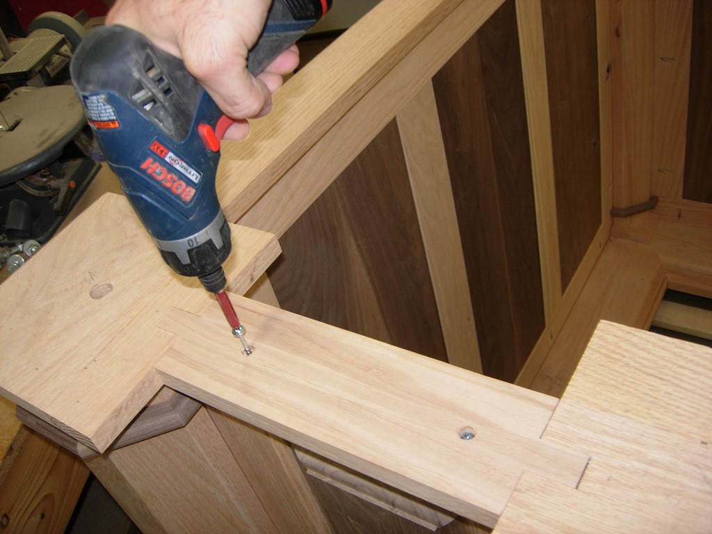 I planed down any high spots that would prevent the top from sitting flat, then drilled a series of mounting holes for the top, around the inside perimeter of the top plates.