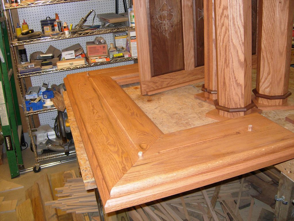 With the top plates attached, I now have a convenient way to hold up my panels, allowing me to stain both sides at the same time. I decided not to push stain down into the carved patterns on the front panels. Hopefully this will give a subtle contrast to highlight the carvings.
