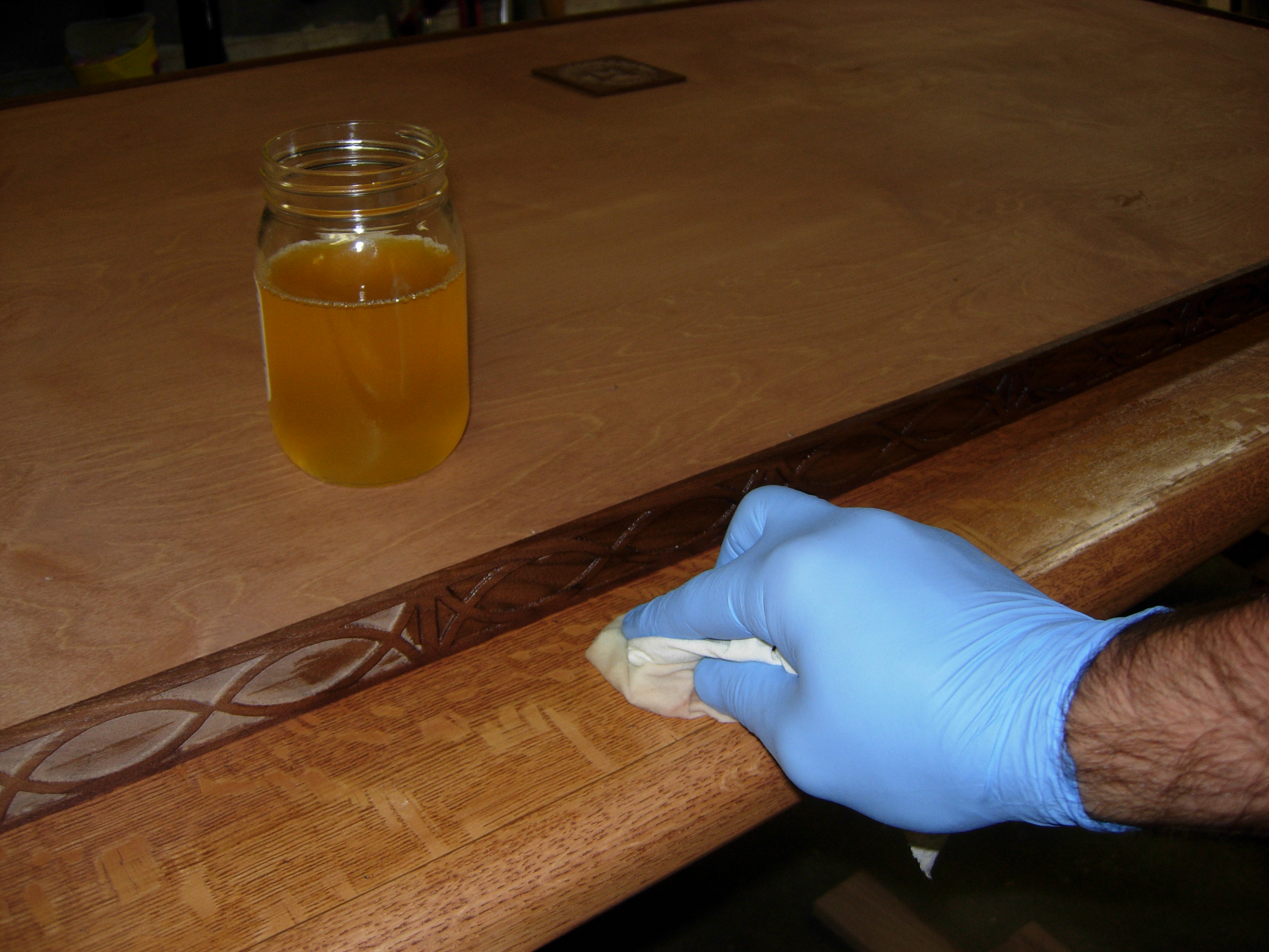 I started out on the bottom side of the altar top. I was interested to see how the walnut looked with a coat of poly on it. I was surprised that the stain didn’t show up more. It seemed to just blend in with the chocolate color of the walnut. That’s ok, I really didn’t like staining the walnut anyway. It looks pretty on its own.