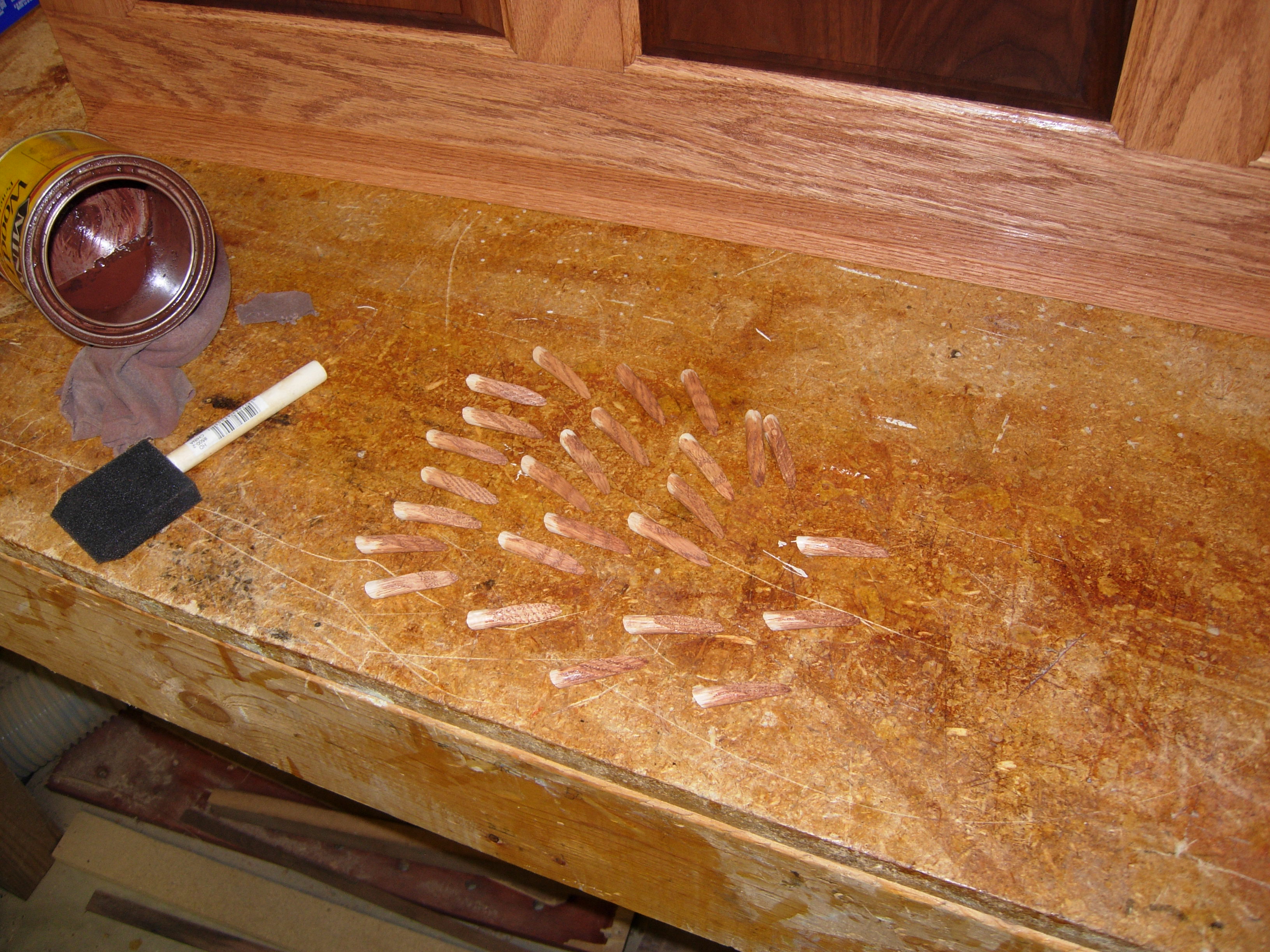 One thing I forgot to do yesterday was stain the plugs for the pocket holes that I drilled the day before. Since the only stain I had left was a bit of sludge at the bottom of the can, I added a bit of thinner to it and stirred it up. This made a slightly thinner sludge which was enough to get some stain on the visible side of the plugs.