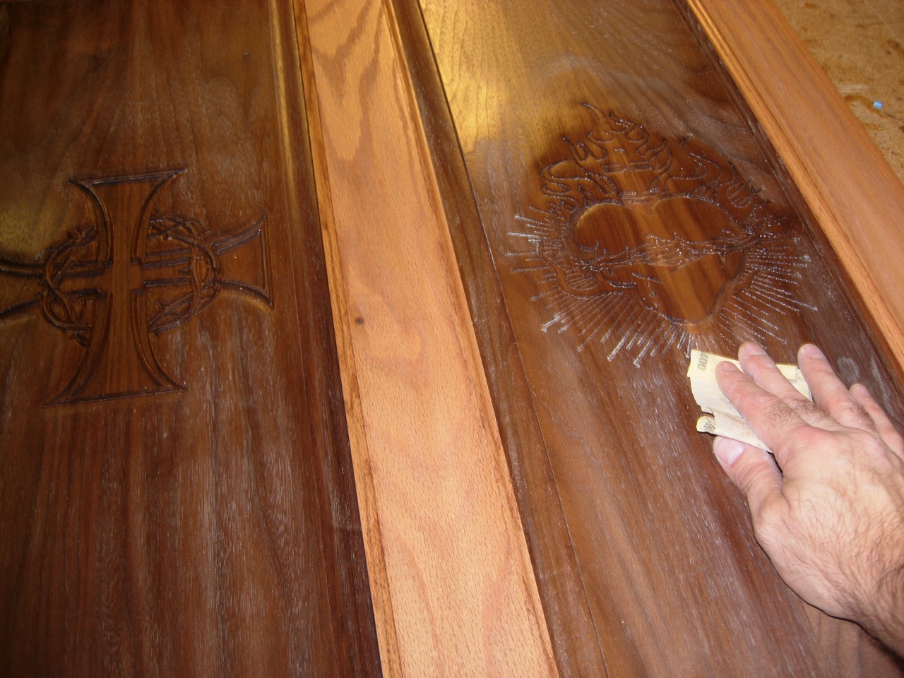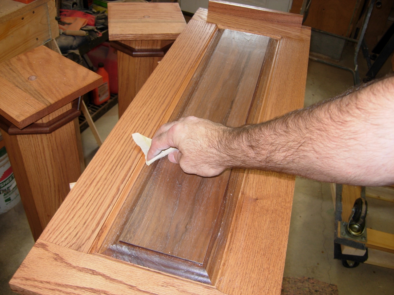 The wiping poly dries pretty quickly, especially when it was the first coat. I was able to squee an extra brush coat on the two tops last night. This morning, I sanded down the panels and the two tops, with 400 grit sand paper, to remove the dust nibs from last night.