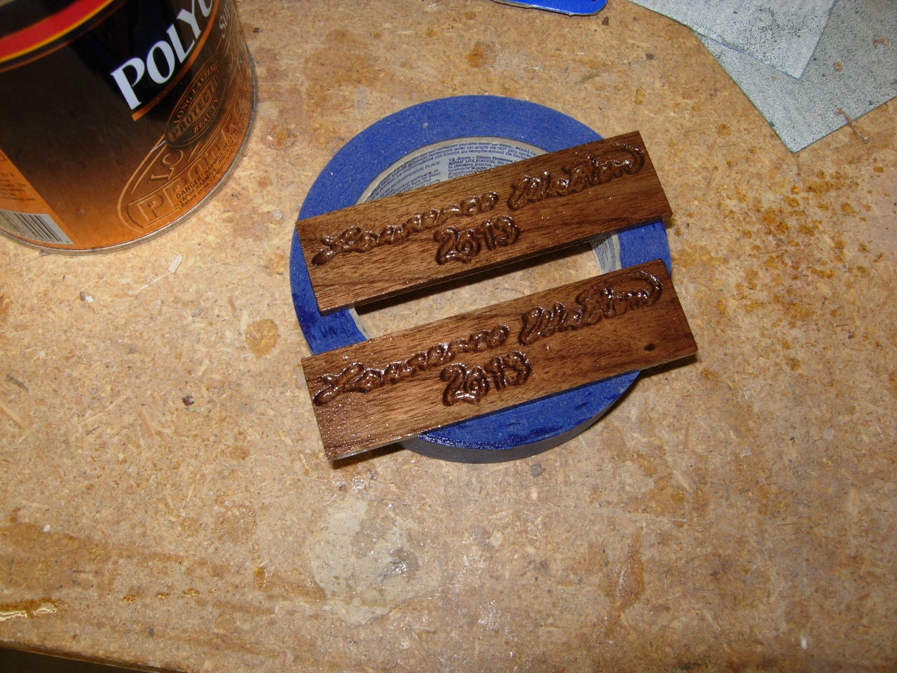 While I was sanding, I had the Carvewright working on another small detail. I decided to add a signature to both pieces, so I am carving them onto a small plate that I will attach when everything is dry.