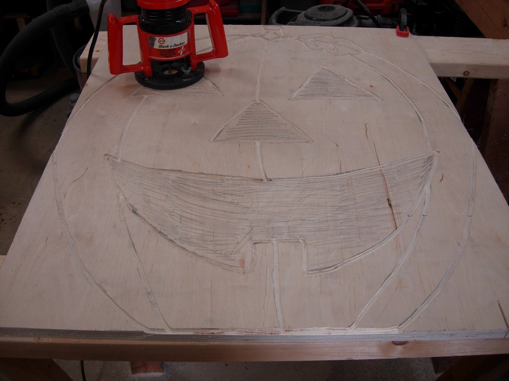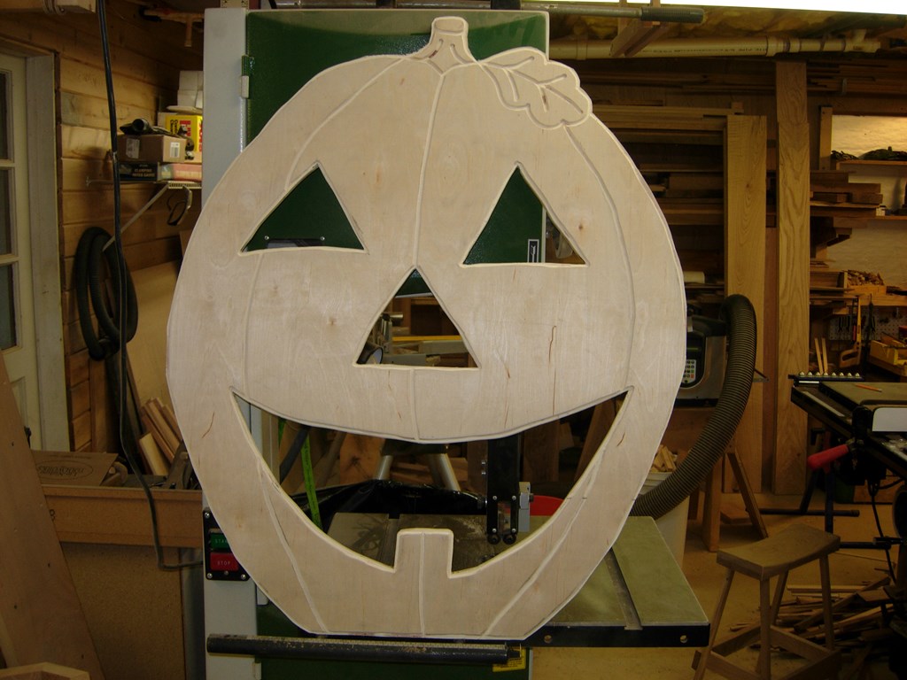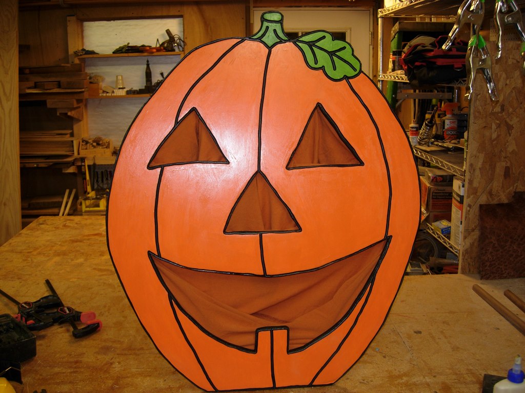 Here is a one day project for your fall festivities. A Jack-O-Lantern bean bag toss game. I started with a scrap piece of 3/4″ plywood. It was somewhere around 32″ tall by 26″ wide. I spent a few minutes sketching out a pumpkin with a big mouth, a nose and eyes that were big enough for a bean bag.
