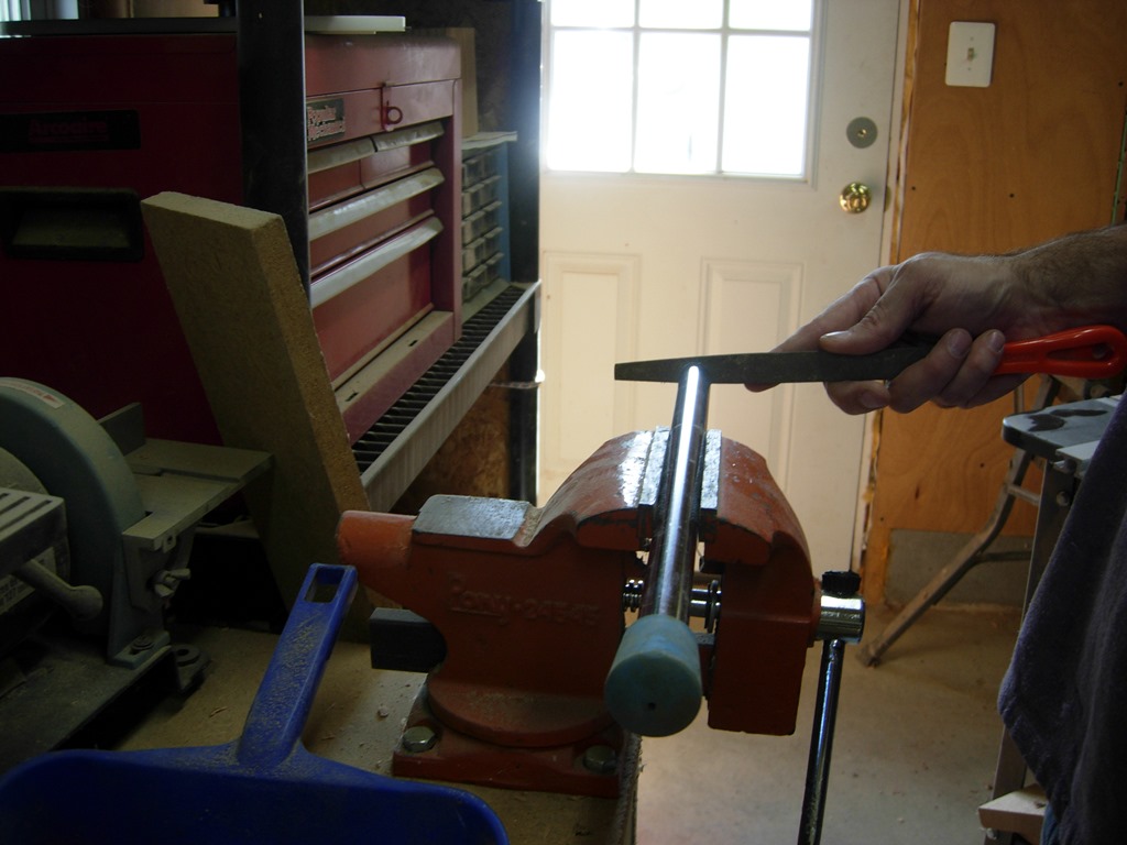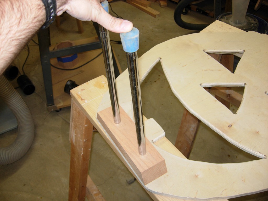 I had a couple of legs from an old baby swing that have been sitting on the floor in my shop for about 15 years now. They looked like they would be useful, so I kept them until I had a need for them. Two of them are being used as legs for the drop-down outfeed table on my work bench. The other two will now become the support legs for the pumpkin. I put them in a vice and cut them down to about a foot long. You could use 3/4″ dowels for this, but I had the legs, I didn’t have any dowels…