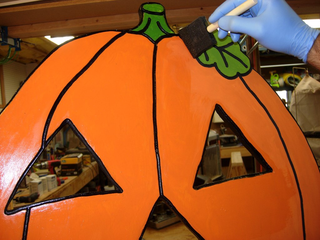 With the legs installed, I started painting the grooves of the pumpkin. You may notice that I cut grooves around the outside and the openings, this was so I could paint them and have outlines around the pumpkin and the openings as well.