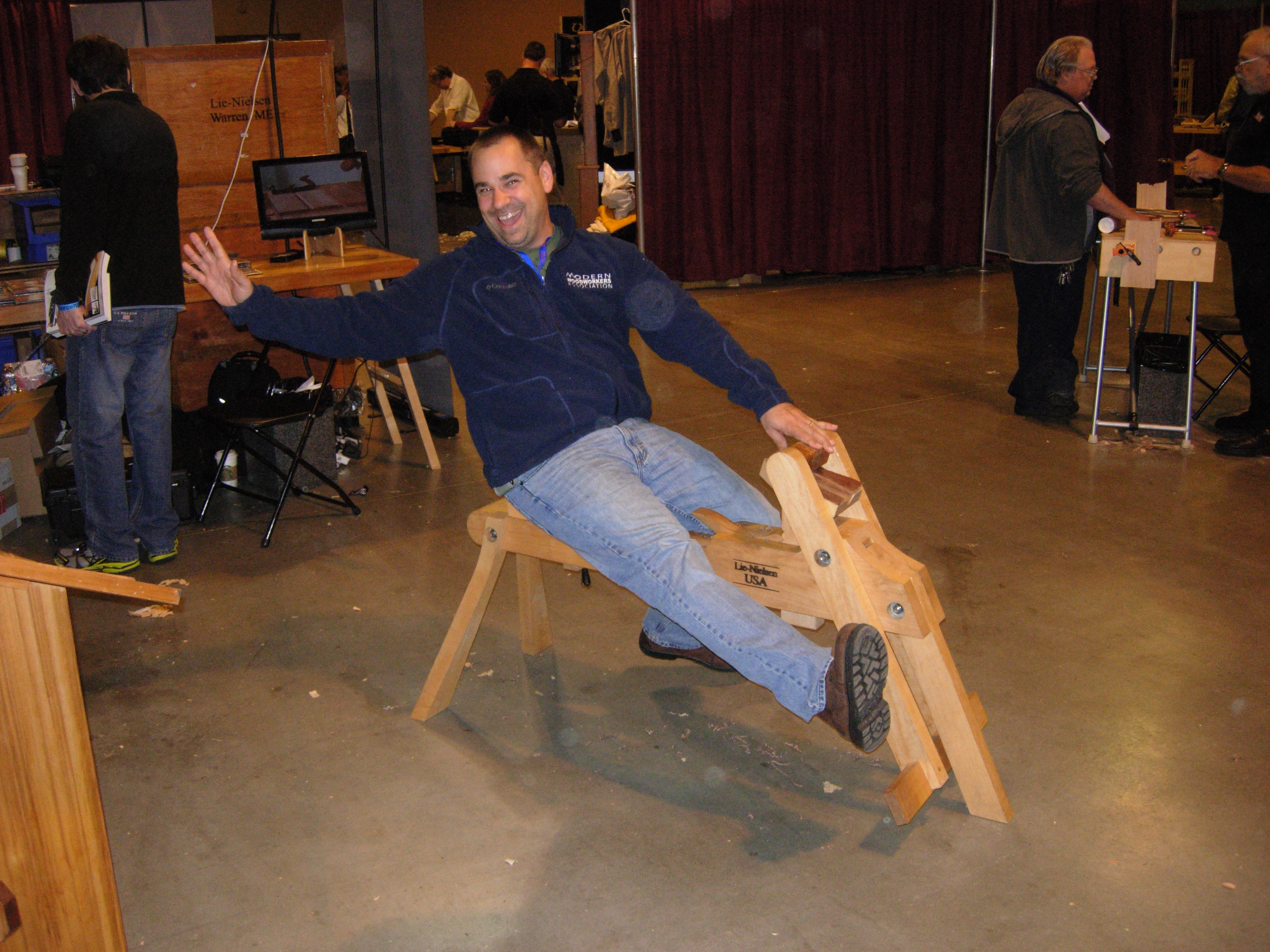 Towards the end of the show, everyone started to wind down and have a little fun. Tom showed Dyami how much he missed him, and the gentleman in the picture below showed Chris Schwarz another use for one of his workbenchs. Since Chris has become the “Workbench Guy” he never thought of using them for bottle openers…