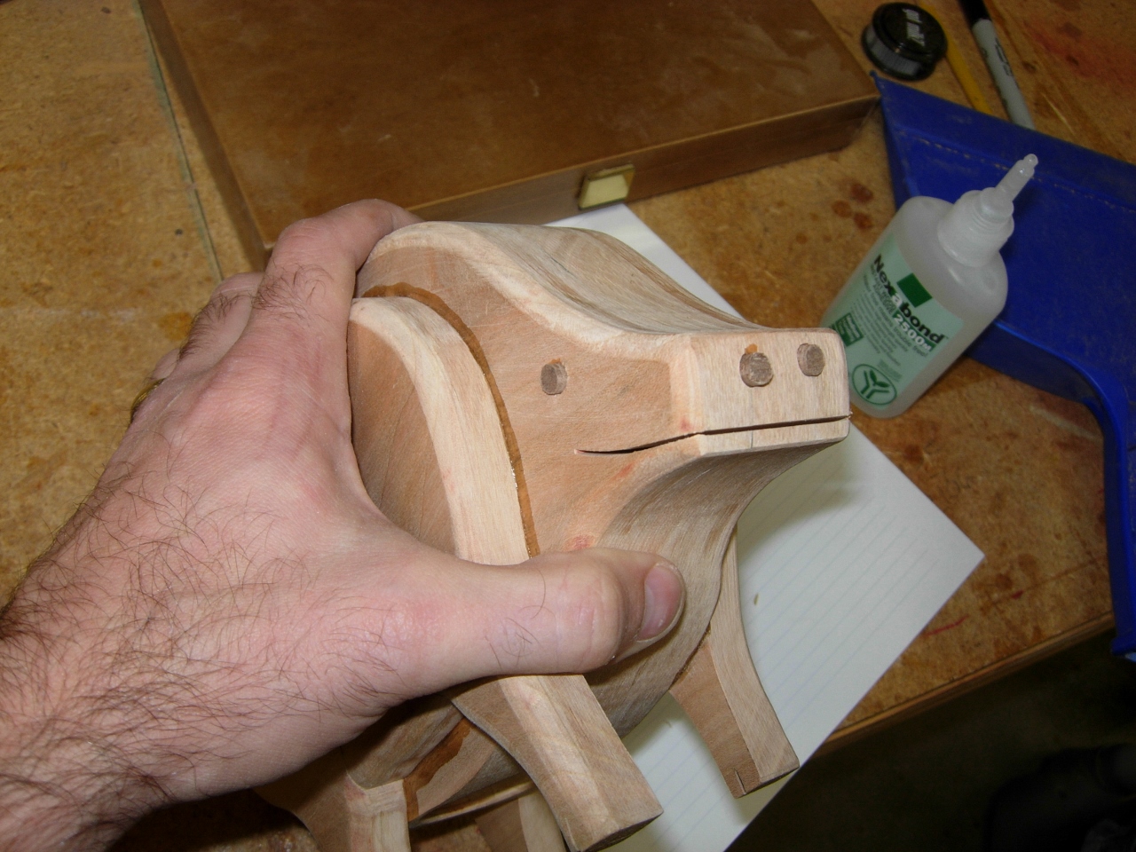 Once the finishing is done, all we will have to do is cut out some leather ears and attach them with some brass tacks.